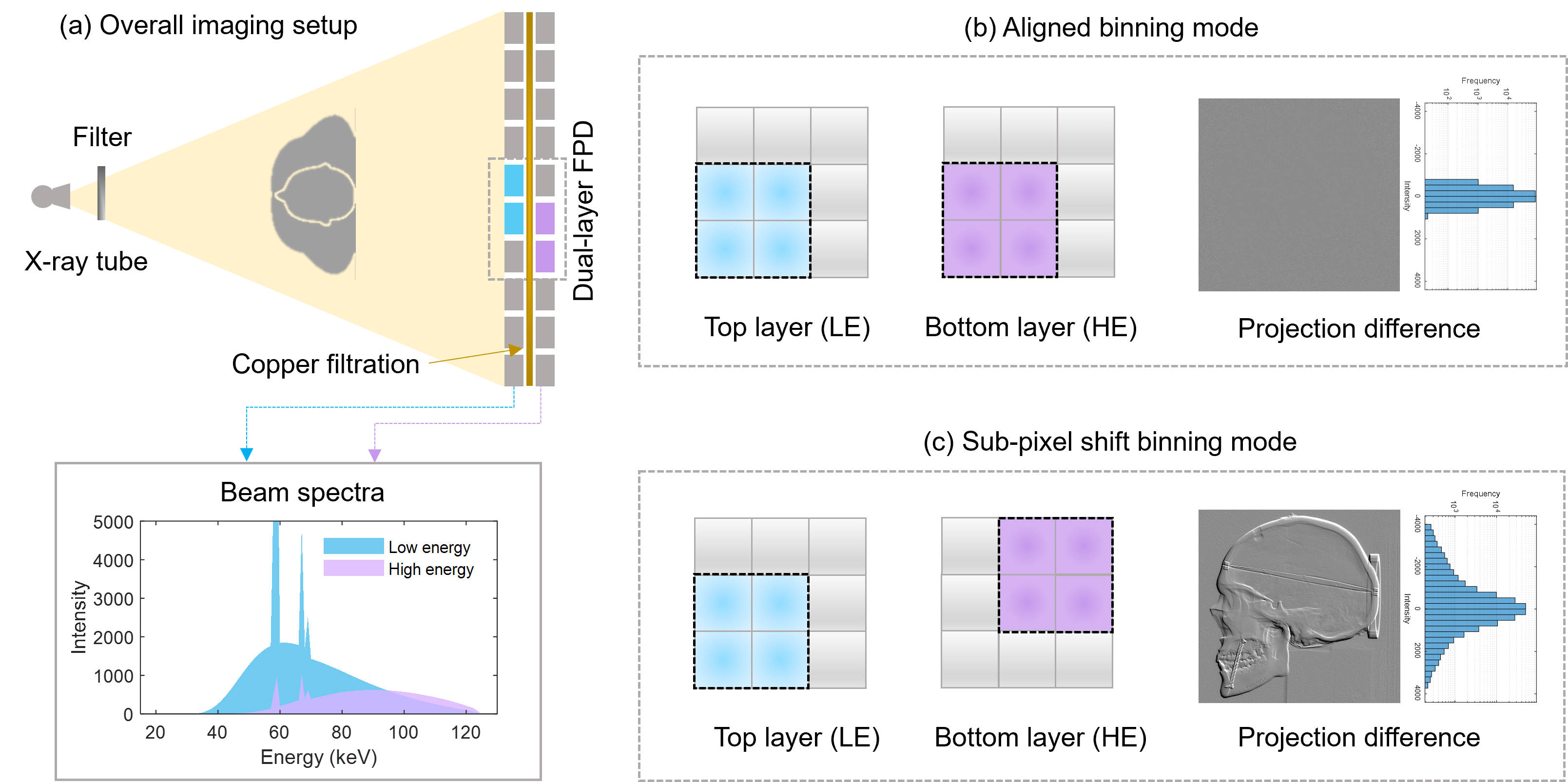 針對上述錐束CT成像面臨的共性關(guān)鍵挑戰(zhàn),中國科學(xué)院深圳先進技術(shù)研究院醫(yī)工所CT成像物理與系統(tǒng)實驗室的葛永帥研究員及其團隊提出了一種基于雙層平板探測器亞像素位移的新型錐束能譜CT成像方案(圖2)。該方案通過上層和下層探測器像素單元錯位讀出的方式將空間信息采樣率提升一倍,有效克服了探測器像素合并(快速掃描)引起的空間分辨率降低問題。物理實驗結(jié)果證明(圖3),該新型錐束能譜CT成像方案可以在相同成像速率下,將錐束CT圖像的空間分辨率提升至少30%。該研究成果為加快推動高時空分辨錐束能譜CT成像技術(shù)與系統(tǒng)變革提供了嶄新的解決方案。相信在不久的將來,這一技術(shù)將為血管介入治療、牙科檢查、乳腺癌篩查等眾多臨床場景提供全新的高時空分辨錐束CT成像解決方案,大幅改善錐束CT圖像質(zhì)量。