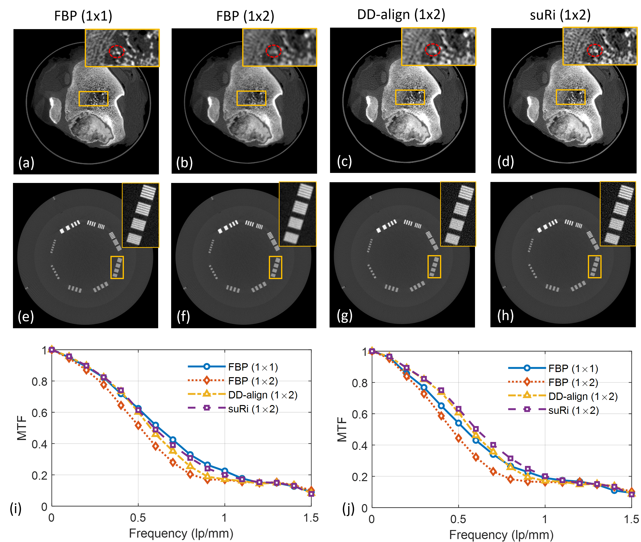 (i)-(j)為測量的CT圖像的MTF曲線??梢钥闯?,本工作提出的suRi方法在1x2像素合并下的成像性能與1x1像素合并的成像性能相當(dāng)。