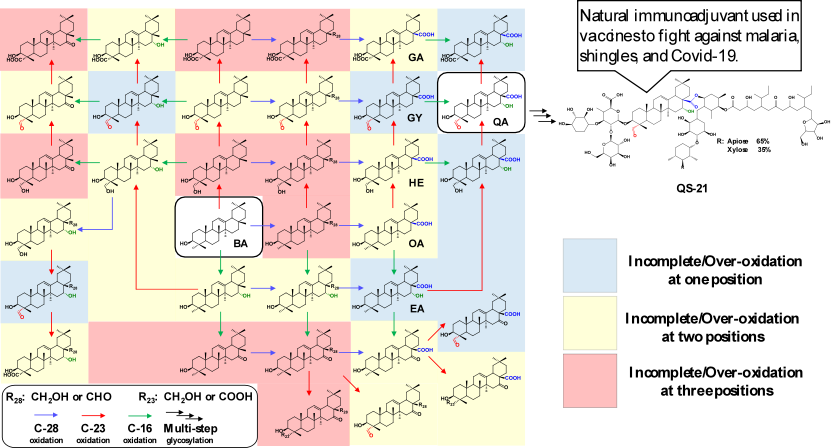 以QS-21、QS-7、QS-17為代表的皂樹皂苷已經(jīng)作為天然免疫佐劑被廣泛應(yīng)用于帶狀孢疹、瘧疾、和Covid-19等疫苗中。而在皂樹中發(fā)現(xiàn)的58種三萜皂苷中,有49種皂苷的苷元為QA。構(gòu)建高產(chǎn)QA的酵母細(xì)胞工廠可以為高效生物合成QS-21等天然免疫佐劑奠定基礎(chǔ)。在QA的生物合成中,需要將BA的C-16、C-23、和C-28分別氧化為羥基、醛基、和羧基。高效生物合成QA需要實現(xiàn)這三個位點的氧化平衡,否則會出現(xiàn)46種過氧化或不完全氧化的副產(chǎn)物(圖一),而過多的副產(chǎn)物不僅降低目標(biāo)化合物產(chǎn)量,也增加純化成本。