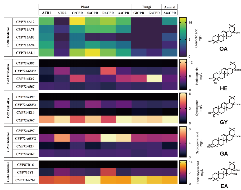在本研究中,研究人員首先構(gòu)建了可以生產(chǎn)BA的底盤菌株,并利用該底盤篩選了12個不同的CYP以確定最優(yōu)的候選基因用于QA的生物合成。實驗發(fā)現(xiàn)CYP716A12在氧化BA的C-28生成Oleanolic acid (OA)時效率最高,CYP716A262氧化OA生成EA時的效率最高,CYP714E19主要氧化OA生成C-23羥基產(chǎn)物hederagenin(HE),而CYP72A567主要氧化OA生成C-23醛基產(chǎn)物gypsogenin (GY)和C-23羧基產(chǎn)物gypsogenic acid(GA)。前期文獻(xiàn)報道CYP716A262可以直接將BA的C-16和C-28分別氧化成羥基和羧基得到echinocystic acid(EA)。有別于傳統(tǒng)代謝工程思路去增強CYP716A262基因的表達(dá),本研究通過迭代篩選CYP發(fā)現(xiàn)了CYP氧化的網(wǎng)絡(luò)效應(yīng)。相較于同時表達(dá)CYP716A262和CYP716A12,表達(dá)兩個拷貝的CYP716A262的EA產(chǎn)量要低32.9%(圖三)。