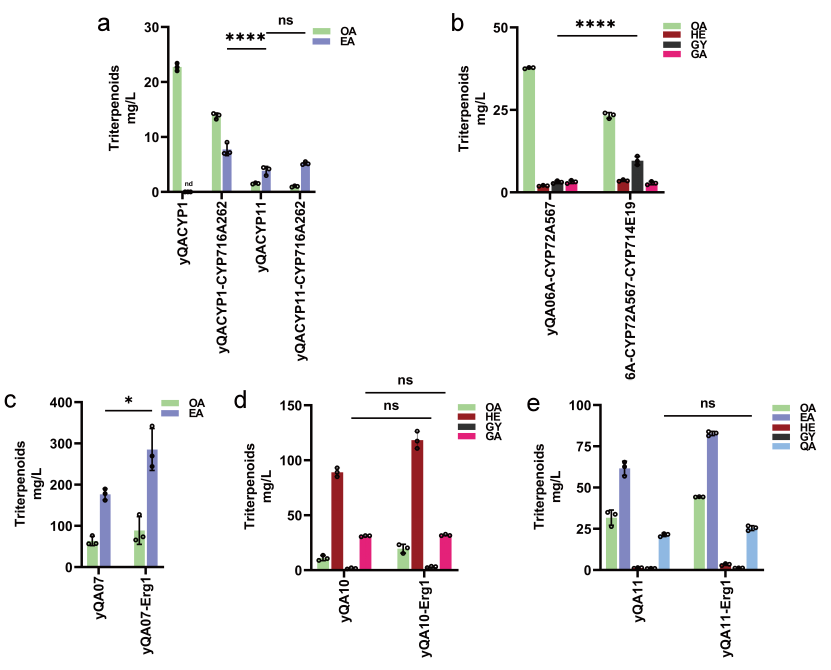 雖然強化代謝流通量是提高產(chǎn)量的有效手段,但是研究人員發(fā)現(xiàn)過表達(dá)釀酒酵母內(nèi)源的erg1只能增加雙位點的氧化產(chǎn)物如EA和HE的產(chǎn)量積累,并不能增加QA的產(chǎn)量,從而證明單純增加前體供應(yīng)對于三位點氧化產(chǎn)物的積累影響較小(圖三)。