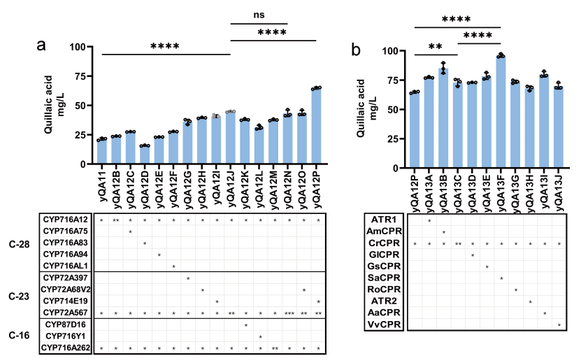 研究人員隨后通過再次迭代篩選候選CYP和CPR,發(fā)現(xiàn)表達(dá)兩個拷貝的CYP72A567和一個拷貝的CYP714E19時QA的產(chǎn)量要高于表達(dá)三個拷貝的CYP72A567(圖四),再一次證明了CYP氧化的網(wǎng)絡(luò)效應(yīng)存在。而在CYP網(wǎng)絡(luò)中引入能與CYP72A567和CYP716A262更好組合的SaCPR,也可以進(jìn)一步提高QA的產(chǎn)量。通過在菌株yQA11中再增加一個拷貝的CYP72A567,并引入CYP714E19和SaCPR得到菌株yQA12P,QA的產(chǎn)量增加了350%,達(dá)到95.9 mg/L。