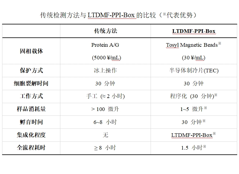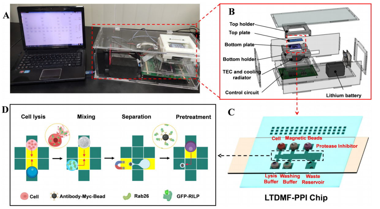 蛋白質(zhì)-蛋白質(zhì)相互作用(Protein-protein interaction, PPI)是生命體系中最基本的一種現(xiàn)象,它們在細胞內(nèi)扮演著重要的角色。各種生物學過程和疾病的發(fā)生、發(fā)展和預測都離不開蛋白質(zhì)-蛋白質(zhì)之間的相互作用,研究蛋白質(zhì)之間的相互作用對于理解疾病的發(fā)生、發(fā)展具有重要的意義,通過科學方法精準測定其作用途徑和作用方式等本質(zhì)信息,能夠極大助力諸如新型藥物靶標發(fā)現(xiàn)等生物醫(yī)學研究及藥物研發(fā)。目前,常見的PPI的檢測方法有串聯(lián)親和純化、熒光共定位、熒光雙分子互補、熒光能量共振轉移、免疫共沉淀和蛋白質(zhì)芯片等。上述方法通常自動化程度不足,難以高效實現(xiàn)并行檢測;此外,受限于當前檢測技術在檢測靈敏度及檢測速度上的不足,難以實現(xiàn)高效、精準的PPI測量。為解決上述難題,研究人員開發(fā)了一種基于低溫數(shù)字微流控系統(tǒng)的PPI檢測盒(LTDMF-PPI-Box),以實現(xiàn)自動、快速、無損、高效的PPI檢測。LTDMF通過編程控制液滴的運動,將PPI的檢測時間從數(shù)十小時縮短至1.5小時。此外,集成熱電冷卻器(TEC)可確保蛋白質(zhì)的工作溫度,將蛋白質(zhì)的保存率提高至90%以上,以利于后步的操作及應用。該團隊以與胰島素分泌密切相關的RILP蛋白和Rab26蛋白之間的相互作用作為原型,進一步證明了LTDMF-PPI-Box的可行性。