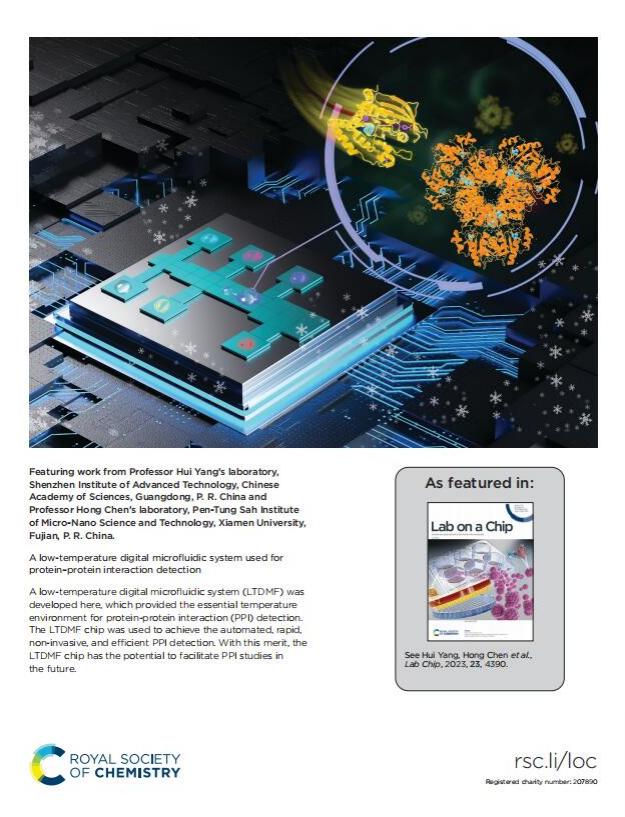 中國科學院深圳先進技術研究院醫(yī)工所楊慧研究員團隊,與廈門大學薩本棟微米納米研究院陳宏教授團隊合作,在Lab on a Chip 上發(fā)表了題為A low-temperature digital microfluidic system used for protein-protein interaction detection的研究,并被選為當期的封底文章 (Back cover)。該團隊開發(fā)了一種基于低溫數(shù)字微流控系統(tǒng)的蛋白質(zhì)與蛋白質(zhì)相互作用檢測盒(LTDMF-PPI-Box),以實現(xiàn)自動、快速、無損、高效的蛋白質(zhì)與蛋白質(zhì)相互作用檢測。本研究中,沈杰男博士和廖嘉琪碩士為共同第一作者,楊慧研究員和陳宏教授為共同通訊作者,中國科學院深圳先進技術研究院為第一通訊單位,廈門大學為第二通訊單位。