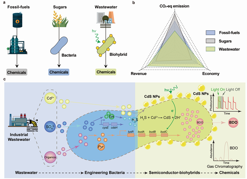 “變廢為寶”的理念與可持續(xù)性發(fā)展高度契合。近年來,通過合成生物學(xué)方法改造微生物細(xì)胞工廠,可直接利用廢棄塑料、餐廚垃圾和工業(yè)廢氣(如CO2)等作為原料,已經(jīng)展示出綠色可持續(xù)生產(chǎn)化學(xué)品的巨大潛力。來自深圳先進(jìn)院的合成生物學(xué)團(tuán)隊(duì)和哈工大(深圳)環(huán)境科學(xué)與工程團(tuán)隊(duì)共同調(diào)研發(fā)現(xiàn),金屬離子、硫酸鹽和有機(jī)物等污染物在廢水中普遍存在且含量豐富,可直接或間接為半導(dǎo)體材料-細(xì)菌雜合體的生產(chǎn)提供原料,降低規(guī)?;a(chǎn)雜合體的成本;而且,該雜合體在廢水中能夠直接利用光能驅(qū)動(dòng)有機(jī)污染物轉(zhuǎn)化為化學(xué)品,實(shí)現(xiàn)污染物的資源化利用。