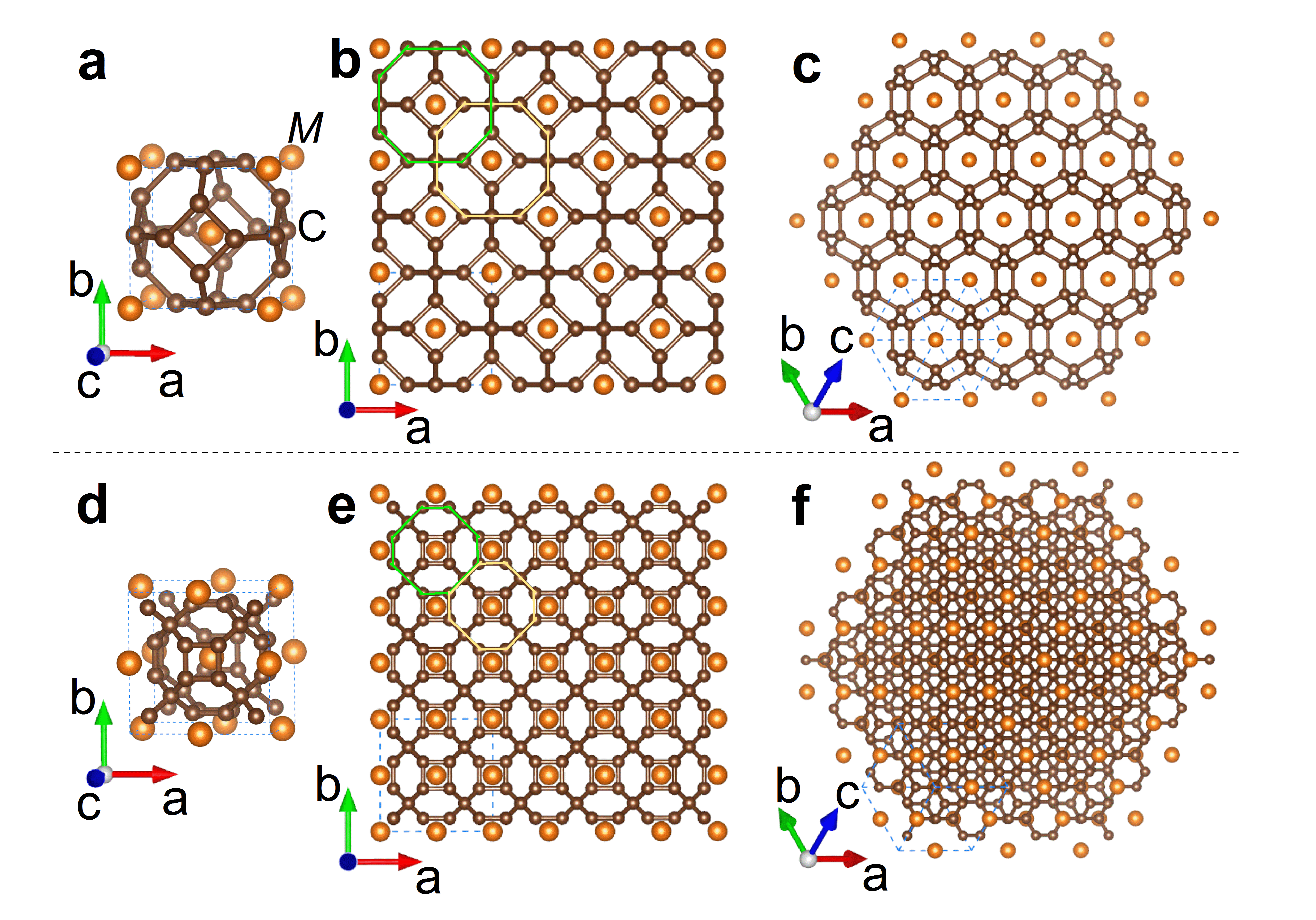 圖1.(a)-(c)對(duì)應(yīng)為C24籠單元和 C24籠耦合后形成的網(wǎng)絡(luò)狀結(jié)構(gòu),不同方向視圖。(d)-(f)對(duì)應(yīng)為C32籠單元和 C32籠耦合后形成的網(wǎng)絡(luò)狀結(jié)構(gòu),不同方向視圖。