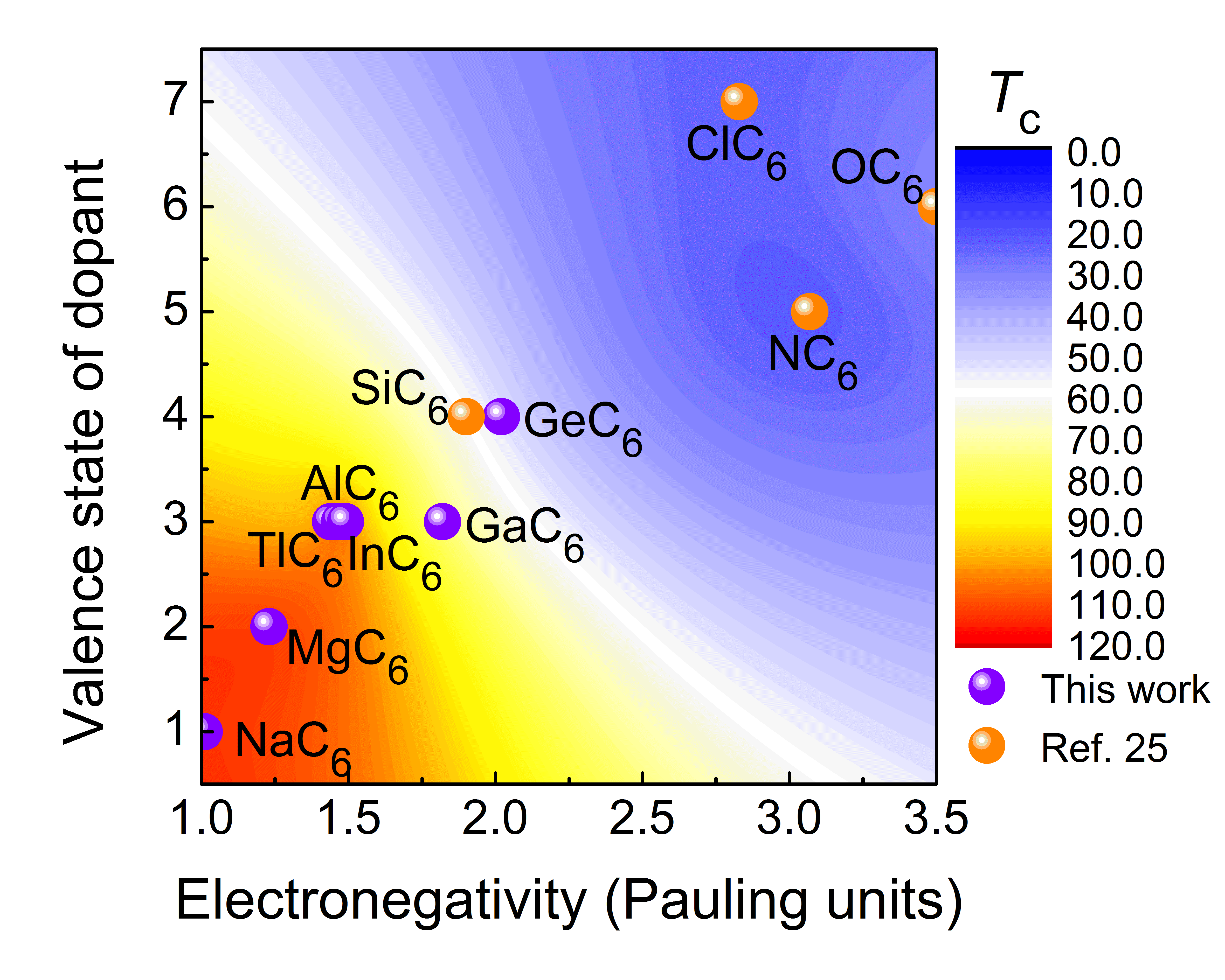 圖3. 其他元素?fù)诫sC24籠后,超導(dǎo)轉(zhuǎn)變溫度與摻雜元素電負(fù)性和價(jià)態(tài)的關(guān)系。