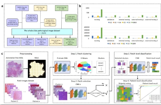 圖2. 腦膠質(zhì)瘤人工智能病理整合診斷系統(tǒng)的數(shù)據(jù)集和算法流程