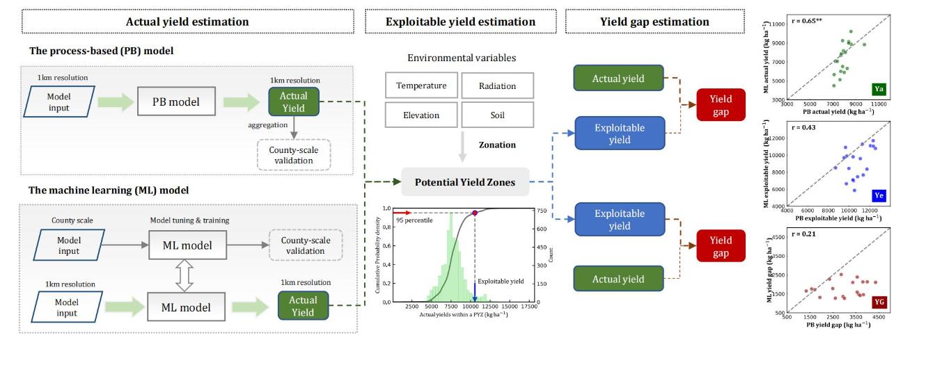 研究人員基于多模態(tài)衛(wèi)星遙感、氣象觀測和地面調(diào)查數(shù)據(jù)融合和信息挖掘技術(shù),提出大尺度農(nóng)業(yè)系統(tǒng)的像元級動態(tài)模擬框架,突破了傳統(tǒng)站點模擬的空間升尺度限制。在此框架下,對比分析了不同建模范式對農(nóng)業(yè)系統(tǒng)生產(chǎn)潛力模擬精度的影響,闡述了不同建模范式的不確定性來源及其在實際產(chǎn)量、潛在產(chǎn)量和產(chǎn)量差模擬中的疊加傳播機制。結(jié)果表明,像元級機理過程建模是區(qū)域農(nóng)業(yè)系統(tǒng)生產(chǎn)潛力模擬的可靠方法,同時強調(diào)了采用更細粒度代表性觀測數(shù)據(jù)集來訓(xùn)練智能學(xué)習(xí)模型的必要性。研究闡明了不同建模范式在農(nóng)業(yè)系統(tǒng)生產(chǎn)潛力模擬中的優(yōu)勢和不確定性,揭示了大尺度農(nóng)業(yè)系統(tǒng)的增產(chǎn)熱點區(qū)域,并對于推動農(nóng)業(yè)系統(tǒng)模型發(fā)展和保障糧食安全具有重要意義。