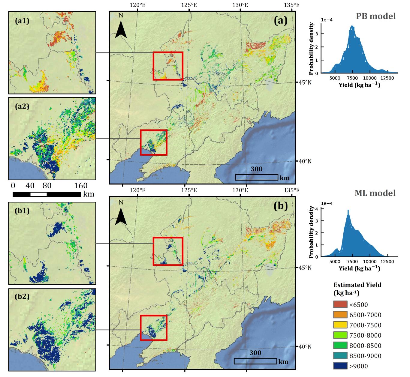 不同模型范式模擬水稻實際產(chǎn)量的空間對比驗證,(a)基于過程模型(Process-based model, PB model)模擬的產(chǎn)量空間分布,(b)基于學(xué)習(xí)模型(Machine learning model, ML model)模擬的產(chǎn)量空間分布。