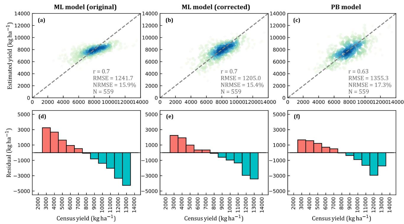 不同模型范式模擬水稻實際產(chǎn)量的地面驗證結(jié)果,(a)學(xué)習(xí)模型(校正前),(b)學(xué)習(xí)模型(校正后)和(c)過程模型。