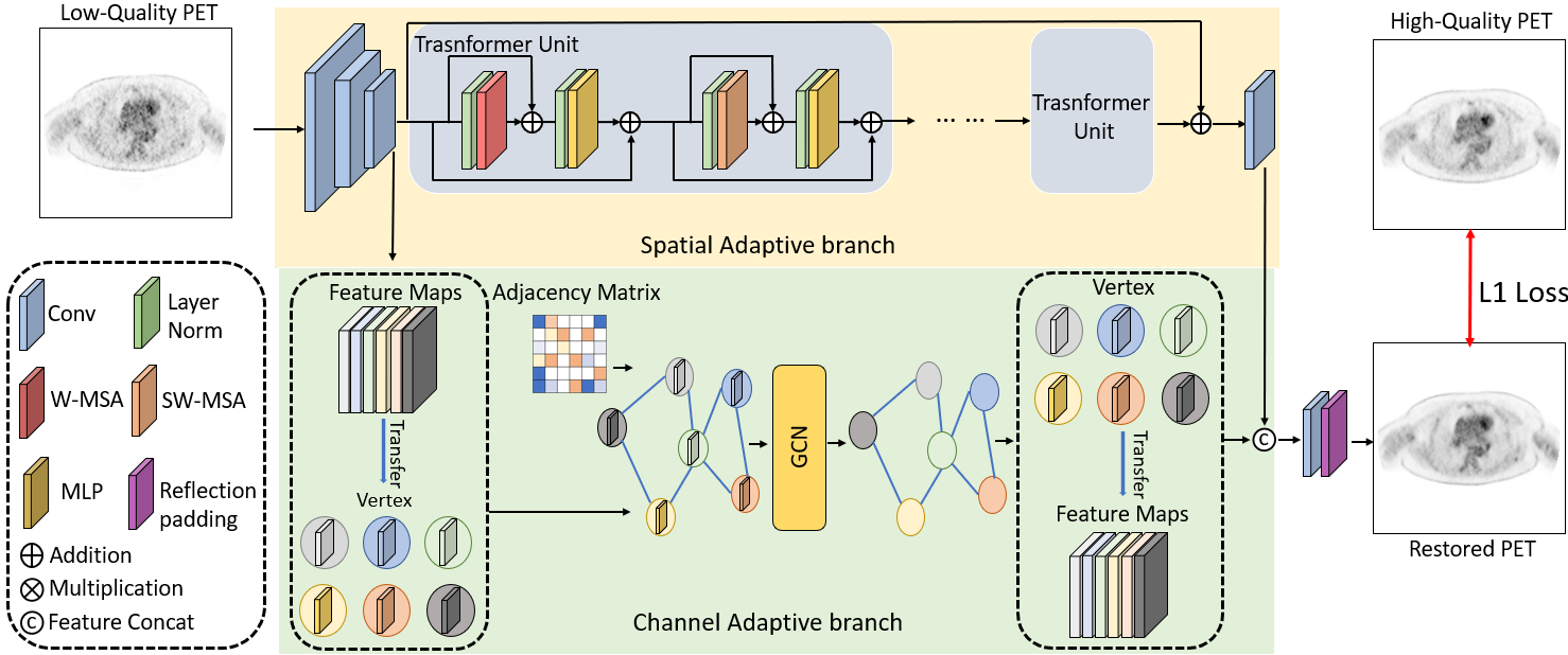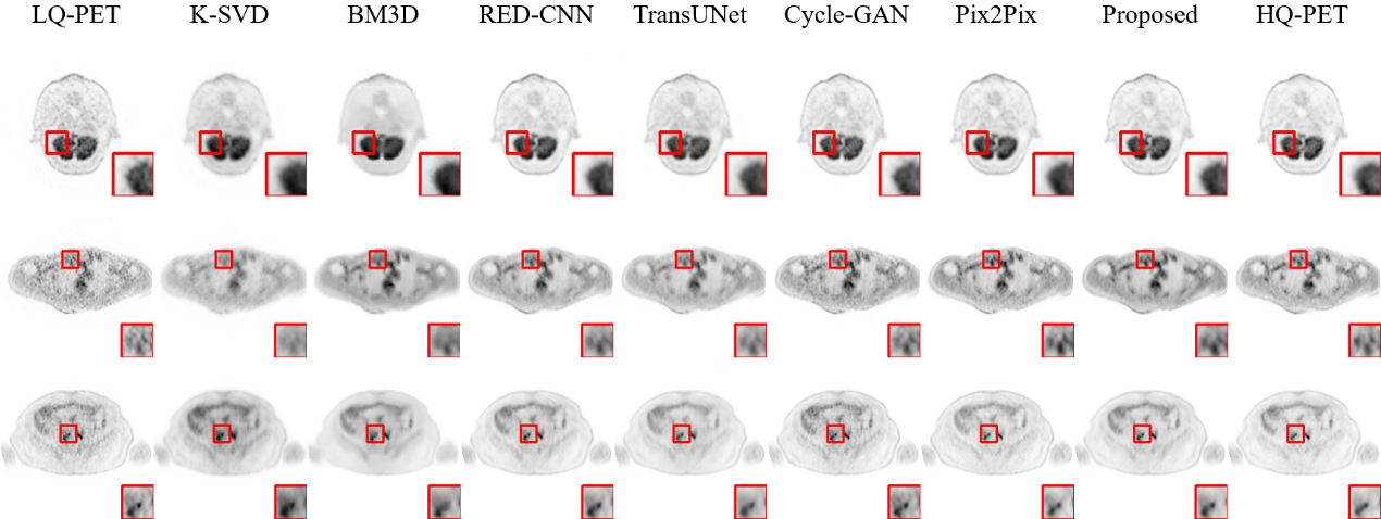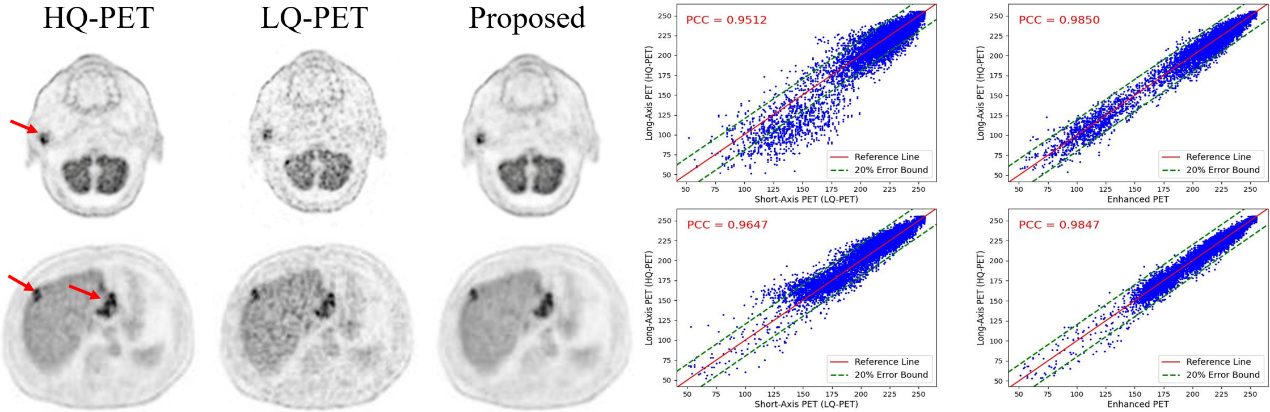 現(xiàn)有臨床PET/CT系統(tǒng)由于軸向視野限制,在分辨率、掃描時間和輻射劑量等方面還有較大提升空間。最近,聯(lián)影醫(yī)療推出的2米PET/CT可以同時實現(xiàn)人體全身PET成像、有效提高圖像質(zhì)量并降低輻射劑量?;?米PET/CT獲取的高質(zhì)量圖像,團隊研發(fā)了一種短軸PET/CT系統(tǒng)的圖像質(zhì)量提升技術(shù),可以實現(xiàn)短軸PET/CT重建圖像的質(zhì)量增強,以彌補其硬件上的軸向視野不足問題。提出模型采用Swin-Transformer和Watts-Strogatz拓撲結(jié)構(gòu)雙支設(shè)計,在短軸PET圖像信息提取的同時兼顧空間和通道兩個維度信息。實驗結(jié)果表明,與現(xiàn)有深度學習和去噪方法相比,提出技術(shù)可以有效提高重建圖像的信噪比和細節(jié)恢復能力。