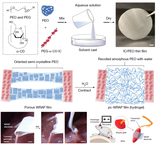 基于這種薄膜構(gòu)筑的形狀自適應(yīng)電極陣列(WRAP電極)大大簡化了植入過程,在潤濕后可保形地包裹不同尺寸的神經(jīng)、肌肉和心臟,并應(yīng)用于體內(nèi)神經(jīng)刺激和電生理信號記錄。研究表明,這種新型水響應(yīng)材料在塑造下一代生物組織電子界面以及拓寬形狀自適應(yīng)材料的生物醫(yī)學(xué)應(yīng)用方面具有潛在重要作用 。