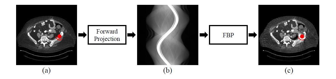 圖1. (a)表示病人體內(nèi)的金屬植入物;(b)表示被金屬影響的CT正弦圖;(c)表示有著嚴(yán)重金屬偽影的重建圖像。