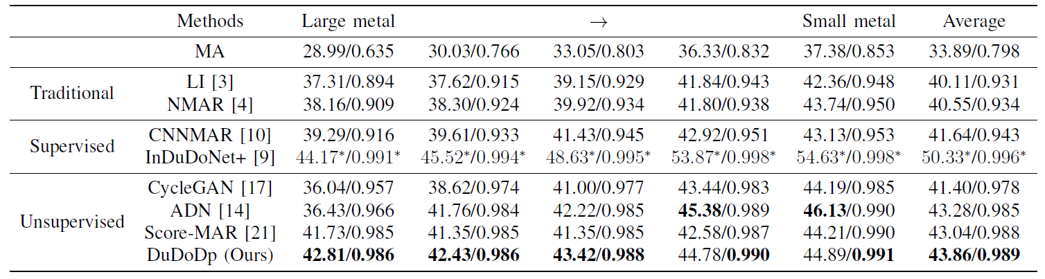 圖3. 不同金屬偽影去除方法的PSNR/SSIM比較,其中粗體表示在無監(jiān)督方法中的最佳結(jié)果,星號(hào)(*)表示包括監(jiān)督方法在內(nèi)的最佳結(jié)果。