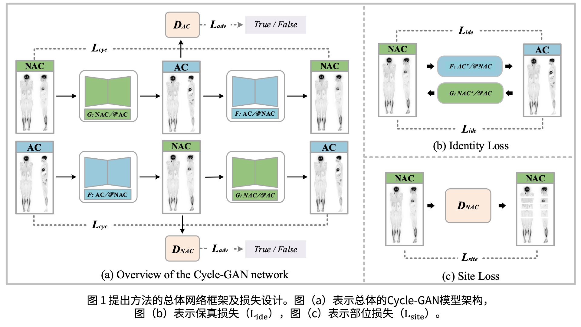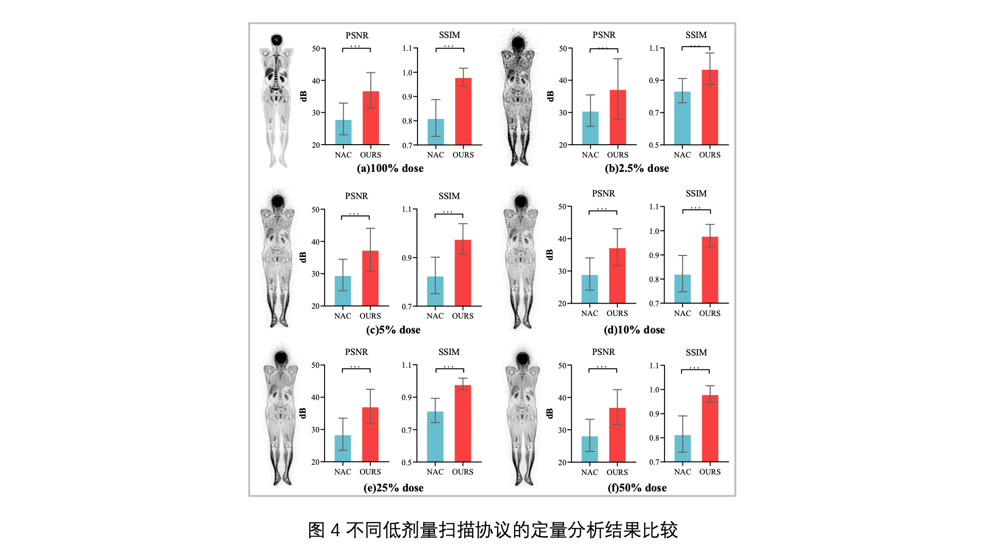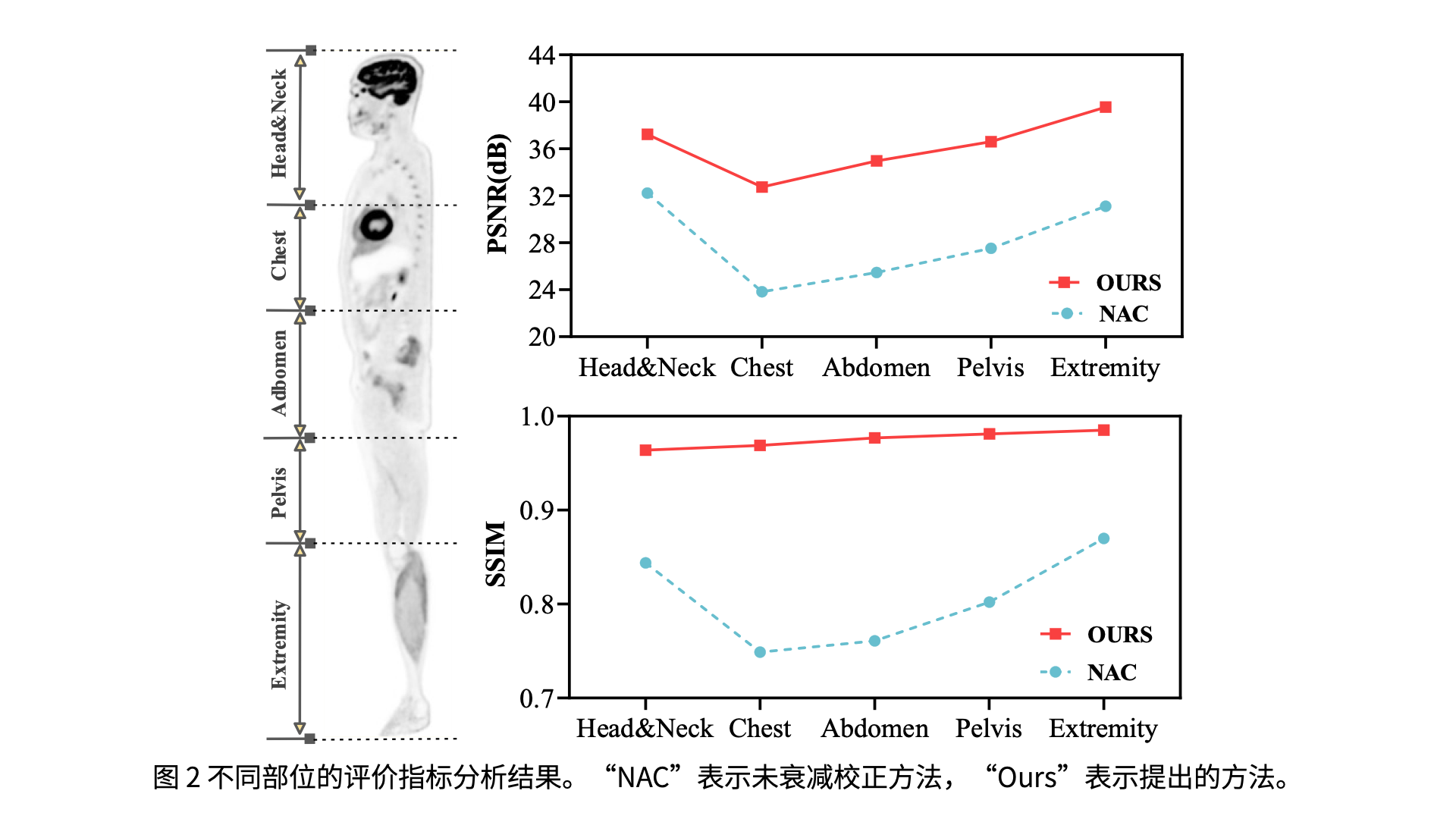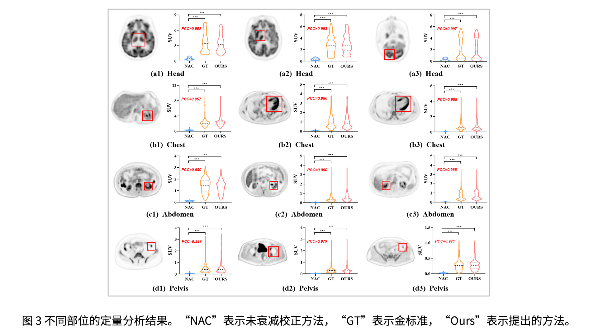 研究團(tuán)隊(duì)立足于解決2米全景 PET/CT 設(shè)備的輻射劑量問題,研發(fā)了一種無需CT的全身PET智能衰減校正技術(shù)。臨床采集了112名人體全身掃描數(shù)據(jù),構(gòu)建Cycle-GAN網(wǎng)絡(luò)結(jié)構(gòu)尋找NAC(未衰減)PET圖像和AC(衰減)PET圖像之間的映射關(guān)系;另外,考慮到人體不同解剖部位兼具一致性和特異性,身體解剖先驗(yàn)信息被引入網(wǎng)絡(luò)模型中增強(qiáng)約束(如圖1)。實(shí)驗(yàn)結(jié)果表明,提出方法生成的衰減校正PET圖像與真實(shí)衰減校正PET圖像非常接近,在不同的解剖部位中圖像質(zhì)量更好、對比度更佳。在量化分析中,平均PSNR和SSIM值分別為36.92?? 5.49 dB(p<0.01)和0.980?? 0.04(p<0.01),與未衰減PET圖像相比提高了20% 和35%(如圖2)。此外,在不同感興趣區(qū)域分析的Pearson相關(guān)系數(shù)均大于0.95(如圖3);比較多個(gè)不同低劑量掃描協(xié)議的結(jié)果,同樣驗(yàn)證了提出方法的有效性(如圖4)。