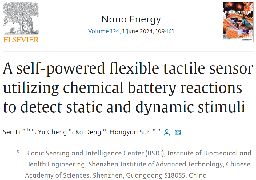 Nano Energy | 深圳先進(jìn)院開發(fā)自供電柔性觸覺傳感器:利用化學(xué)電池反應(yīng)探測靜態(tài)與動態(tài)刺激