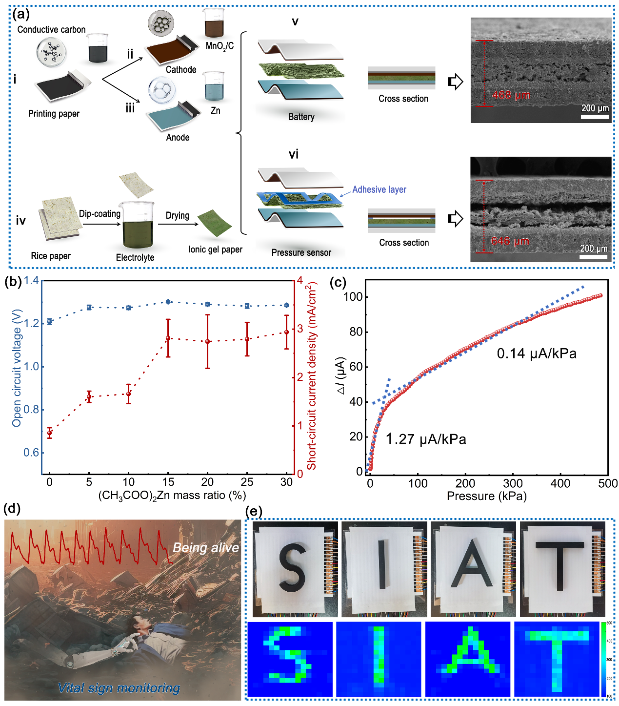 為了解決上述問題,本團(tuán)隊(duì)通過簡單的結(jié)構(gòu)設(shè)計(jì),將紙質(zhì)基底的固態(tài)Zn-MnO2電池轉(zhuǎn)變?yōu)樽怨╇妷毫鞲衅鳌W鳛殡姵?,其展現(xiàn)出了1.29 V的開路電壓、2.8 mA/cm2的最高短路電流密度,足以為小型電子器件供電。作為自供電壓力傳感器,其具有較高的靈敏度,在0-25 kPa范圍內(nèi)平均為1.27 μA/kPa,在25-500 kPa范圍內(nèi)平均為0.14 μA/kPa,響應(yīng)時間為42 ms,恢復(fù)時間為41 ms,最小壓力分辨率達(dá)到數(shù)十帕斯卡,且具有長期重復(fù)性和穩(wěn)定性。該工作將極大地促進(jìn)智能,自供電觸覺傳感器的進(jìn)一步發(fā)展,廣泛應(yīng)用于人類健康護(hù)理和檢測靜態(tài)/動態(tài)刺激的人機(jī)界面等領(lǐng)域。