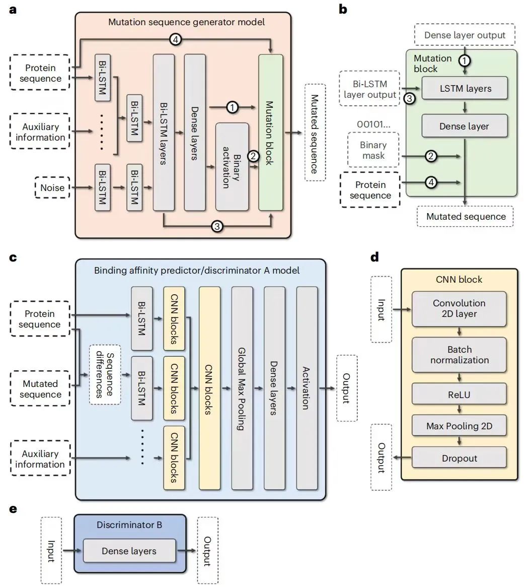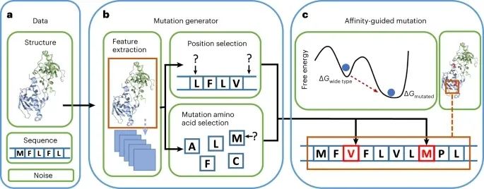 生成器的輸入需要三種類型的數(shù)據(jù):蛋白質的氨基酸序列、蛋白質的結構/輔助數(shù)據(jù)和與蛋白質相關的噪聲(圖1a所示)。突變生成器與兩個鑒別器和親和力預測器一起,在新的兩階段對抗訓練過程中組織,使突變生成器能夠提取所需的特征。得益于其架構,突變生成器能夠確定突變位點和這些位點上的氨基酸替換(圖1b所示),從而朝向指定的親和力變化方向(圖1c所示)。
