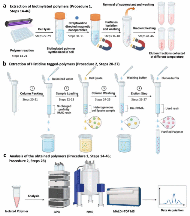 根據(jù)胞內(nèi)大分子聚合物的特定特性以及它們所在的細胞,團隊開發(fā)了兩種方法來分離這些聚合物進行結(jié)構(gòu)和性質(zhì)表征。包括生物素-鏈霉親和素生物偶聯(lián)功能化的磁性納米顆粒和固定化金屬親和色譜法(IMAC)。