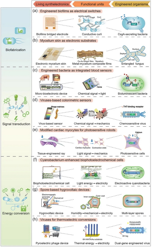 現(xiàn)有部分工作已經(jīng)實(shí)現(xiàn)了以工程生物或其聚集體作為活體單元與傳統(tǒng)電子器件的融合?;诤铣缮飳W(xué)對(duì)細(xì)胞與病毒遺傳物質(zhì)的改造,工程生物體已經(jīng)成功作為活體材料(支架或模板等)、傳感模塊(化學(xué)傳感與刺激響應(yīng)等)或能量轉(zhuǎn)換模塊(半人工光合系統(tǒng)、水伏發(fā)電機(jī)或熱釋電器件等)引入到電子器件中,這些工作為活體電子學(xué)的可行性提供了初步的驗(yàn)證。