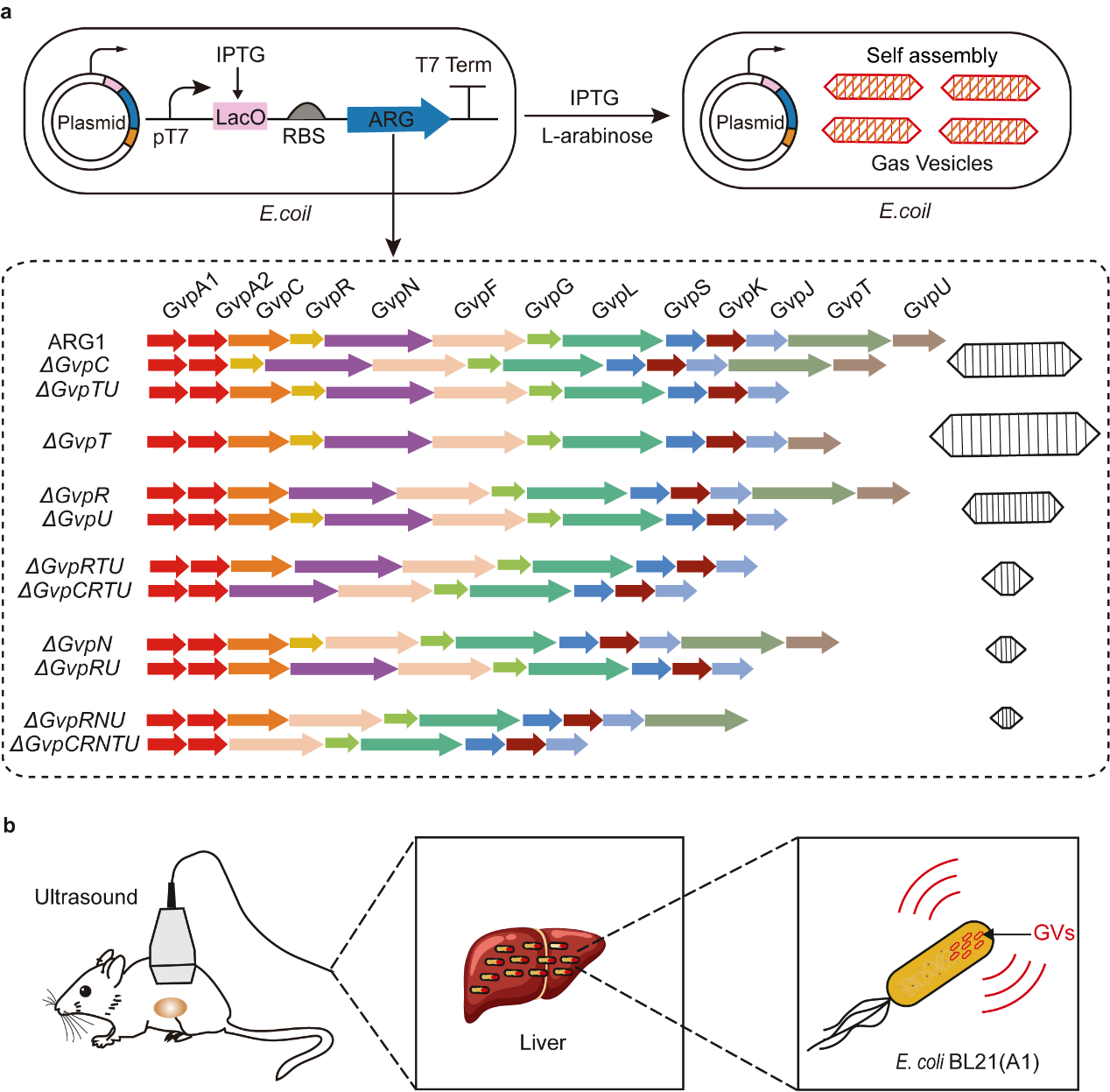 在本項(xiàng)目研究中,研究團(tuán)隊(duì)首先構(gòu)建了去除單個(gè)氣囊基因的缺失突變體,確定了單個(gè)氣囊蛋白對生物氣囊形成的影響。相差顯微鏡與透射電鏡實(shí)驗(yàn)結(jié)果表明ARG1氣囊基因線路中的GvpC,GvpR,GvpN,GvpT和GvpU不是氣囊形成所必需的氣囊蛋白,單獨(dú)敲除GvpR,GvpN與GvpU后氣囊粒徑變小,而敲除GvpT后氣囊粒徑變大。接著,研究團(tuán)隊(duì)通過基因工程的方法,對氣囊粒徑大小進(jìn)行調(diào)控,獲得了不同粒徑大小的超小氣囊(從50 nm到20 nm)。隨后,確定了生物氣囊基因簇合成氣囊所需的最小基因線路(僅為4200 bp),證明了同時(shí)敲除GvpC,GvpR,GvpN,GvpT和GvpU后,大腸桿菌仍然能夠合成生物氣囊。最后,研究團(tuán)隊(duì)評估了大腸桿菌中表達(dá)缺失突變體?GvpCRTU的超聲成像性能,研究結(jié)果表明缺失突變體?GvpCRTU合成的氣囊可在肝臟中產(chǎn)生較強(qiáng)的超聲造影信號。綜上所述,本研究為氣囊蛋白在生物氣囊形成過程中的作用提供了新的見解,產(chǎn)生的超小氣囊具有廣泛的生物醫(yī)學(xué)應(yīng)用前景。