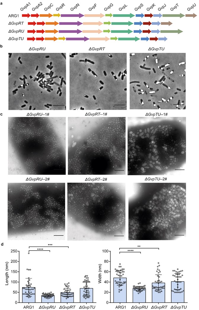 圖2.表達(dá)?GvpRU、?GvpRT、?GvpTU氣囊蛋白突變體的大腸桿菌相差顯微鏡(上排)和電鏡圖(下排)。