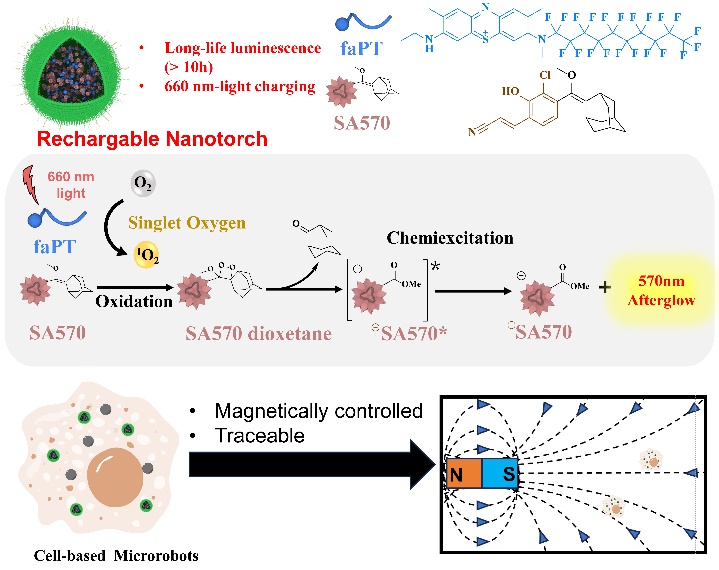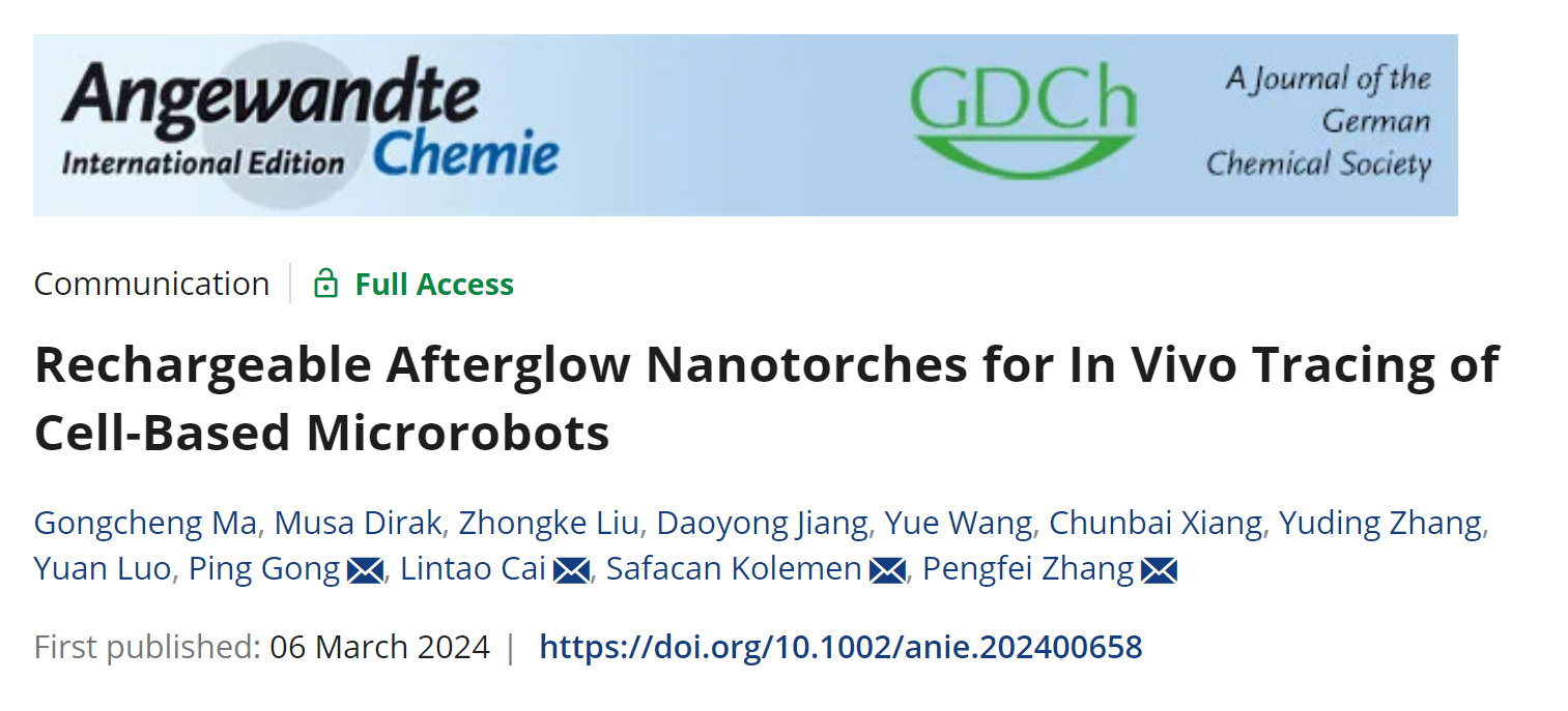 近年來,微/納機器人的飛速發(fā)展,在生物醫(yī)學(xué)領(lǐng)域展現(xiàn)出了巨大的應(yīng)用潛力。但是,如何在體內(nèi)長時程的對微/納機器人進行定位與示蹤面對巨大挑戰(zhàn)。3月6日,中國科學(xué)院深圳先進技術(shù)研究院蔡林濤研究員團隊張鵬飛副研究員、龔萍研究員等和土耳其科奇大學(xué)(Koc University) Safacan Kolemen教授合作,在國際學(xué)術(shù)期刊Angewandte Chemie International Edition發(fā)表研究論文“Rechargeable Afterglow Nanotorches for In Vivo Tracing of Cell-Based Microrobots”。