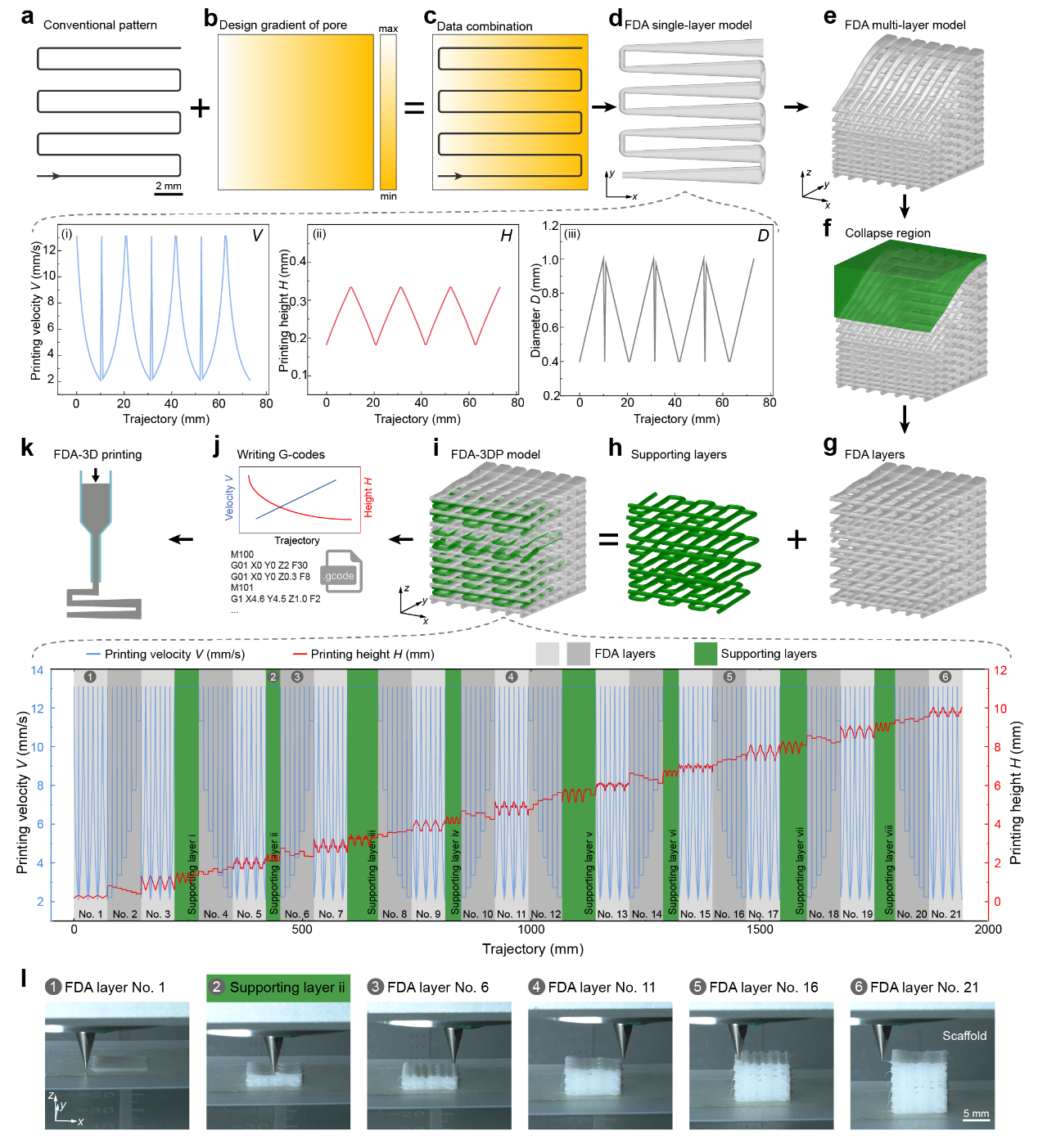圖2. FDA-3DP新策略設(shè)計(jì)和制造梯度多孔結(jié)構(gòu)。