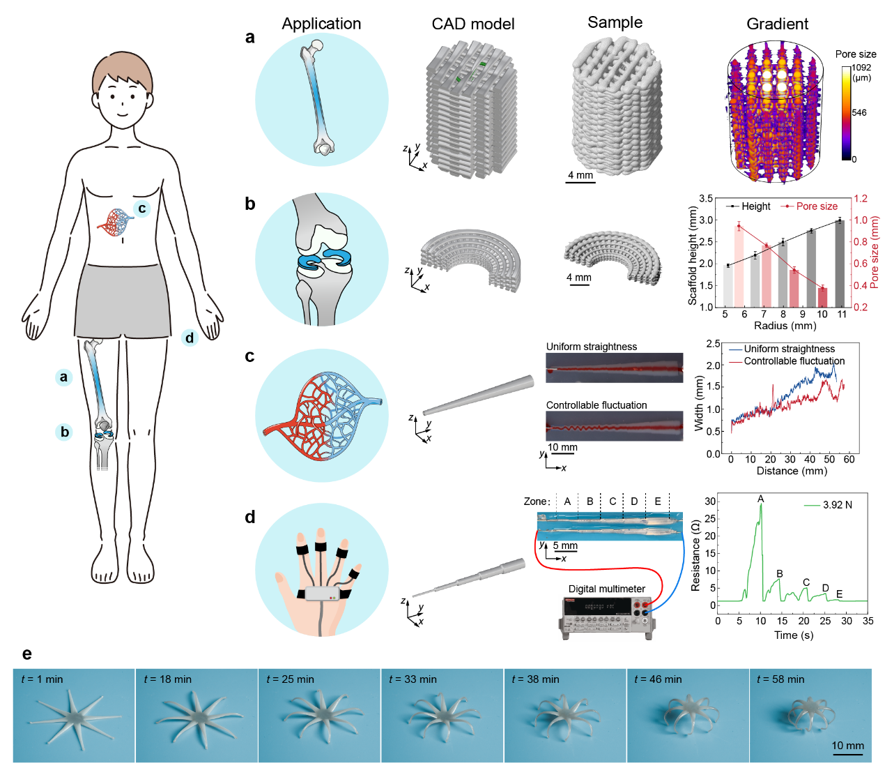 我們提出的FDA-3DP新策略突破了傳統(tǒng)擠出3D打印技術(shù)難以加工復(fù)雜梯度多孔結(jié)構(gòu)的難題,在組織工程與器官體外仿生制造(如骨、軟骨、血管)、4D打印等應(yīng)用場(chǎng)景進(jìn)行了驗(yàn)證(如圖3),有望為器官仿生構(gòu)建提供新策略。