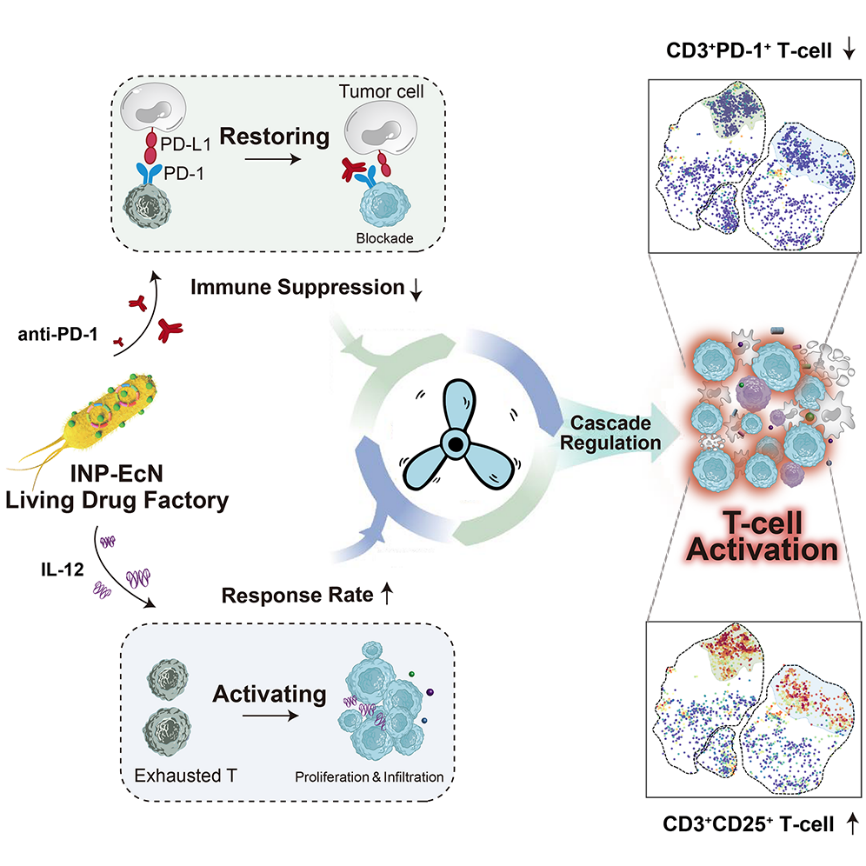 近日,中國(guó)科學(xué)院深圳先進(jìn)院技術(shù)研究院蔡林濤研究員團(tuán)隊(duì)和南昌大學(xué)陳廷濤研究員課題組合作在Cell 旗下知名刊物Cell Reports上線發(fā)表了題為“T cell cascade regulation initiating systemic antitumor immunity through living drug factory of anti-PD-1/IL-12 engineered probiotics”的研究成果。該研究介紹了一種納米工程益生菌“活藥物工廠”,它能夠在體內(nèi)持續(xù)生物合成anti-PD-1抗體以緩解T細(xì)胞免疫抑制,同時(shí)能腫瘤微環(huán)境響應(yīng)釋放IL-12激動(dòng)劑,有效促進(jìn)T細(xì)胞的活化、增殖和浸潤(rùn),從而為免疫檢查點(diǎn)阻斷提供了充足的免疫靶點(diǎn)(激活閾值),并通過(guò)對(duì)T細(xì)胞的“松剎車(chē)+踩油門(mén)”實(shí)現(xiàn)其對(duì)腫瘤微環(huán)境的免疫級(jí)聯(lián)調(diào)控與精準(zhǔn)高效治療。