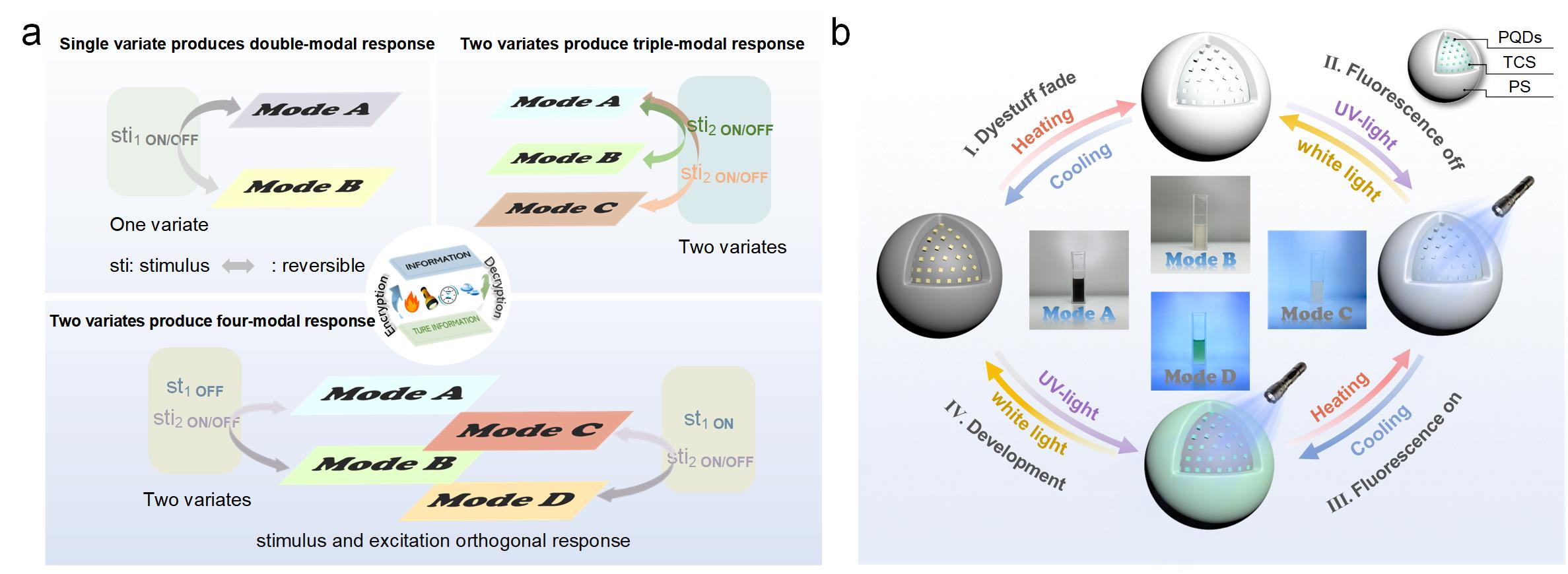 在當(dāng)今信息時(shí)代,數(shù)據(jù)安全變得愈發(fā)重要。隨著信息技術(shù)的快速發(fā)展,對(duì)高性能信息加密和存儲(chǔ)材料的需求也更加迫切。因此需要在早期雙模態(tài)加密材料的基礎(chǔ)上開發(fā)具有更多模態(tài)變化的刺激響應(yīng)材料來提高信息存儲(chǔ)容量和保密性。金屬鹵化物鈣鈦礦量子點(diǎn)憑借其熒光量子產(chǎn)率高、發(fā)射波長(zhǎng)可調(diào)、合成方法簡(jiǎn)單等優(yōu)點(diǎn),已成為信息加密領(lǐng)域的熱門材料,受到廣泛關(guān)注。通過絲網(wǎng)印刷、噴墨打印、3D打印等圖案化技術(shù),可以實(shí)現(xiàn)雙模態(tài)鈣鈦礦材料的信息加密應(yīng)用。此外,研究人員嘗試使用不同的刺激形式(水、極性溶劑、溫度等)來調(diào)控鈣鈦礦材料的發(fā)光信號(hào),從而獲得具有三種模態(tài)的刺激響應(yīng)材料。但是,由于鈣鈦礦材料穩(wěn)定性差,容易導(dǎo)致在接受刺激源后熒光衰減或淬滅,很難實(shí)現(xiàn)熒光信號(hào)的長(zhǎng)效可逆變化,因此限制了鈣鈦礦加密材料的應(yīng)用。
