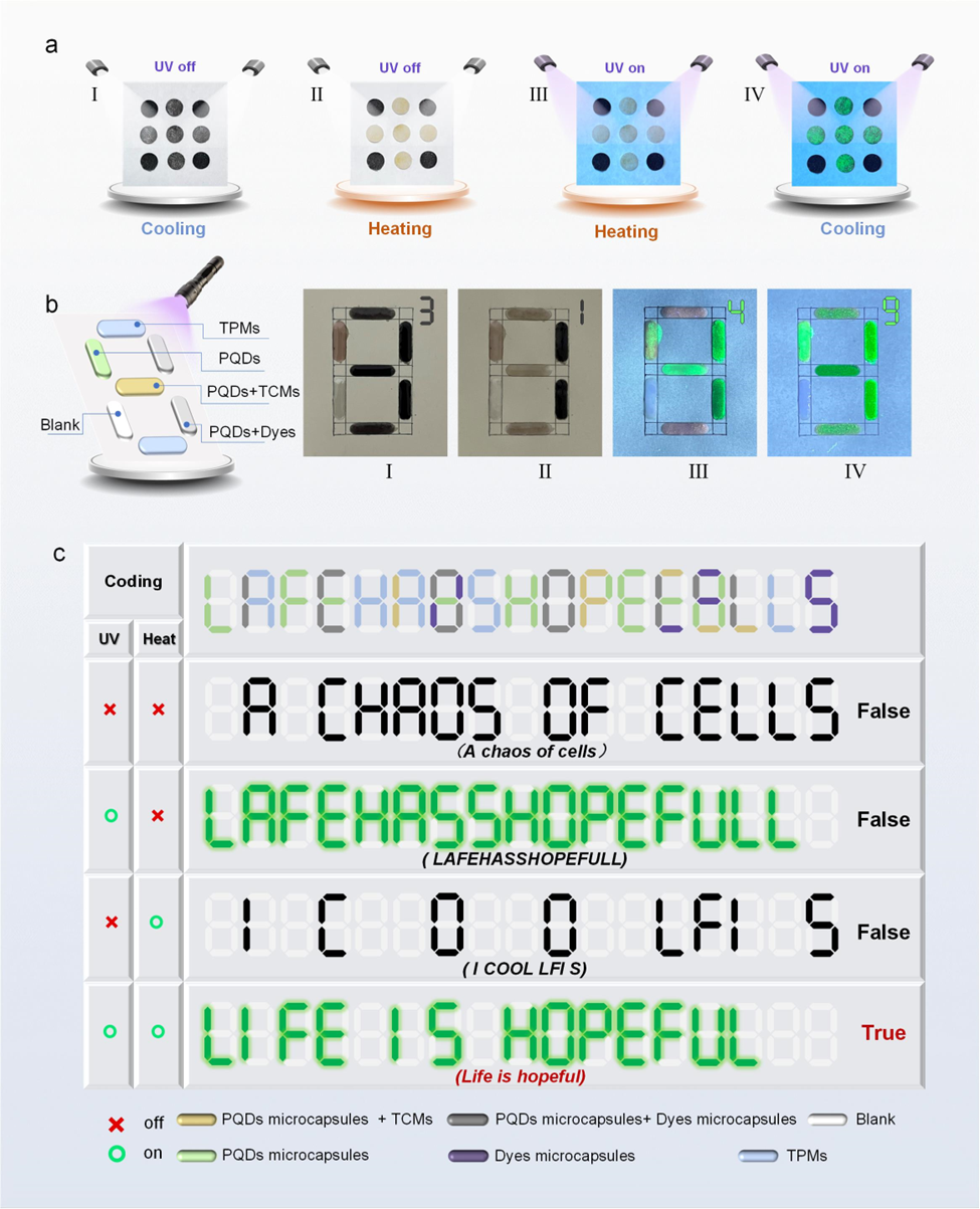 相比于此前報(bào)道的雙刺激響應(yīng)的三模態(tài)材料,本工作中實(shí)現(xiàn)的四模態(tài)材料減少了數(shù)據(jù)冗余,提高了加密安全性和信息存儲(chǔ)密度。通過將熱致變色鈣鈦礦微膠囊與其他顯示材料結(jié)合使用,可以實(shí)現(xiàn)對(duì)圖案、數(shù)字、字母等各類復(fù)雜信息的多級(jí)加密和解密功能。