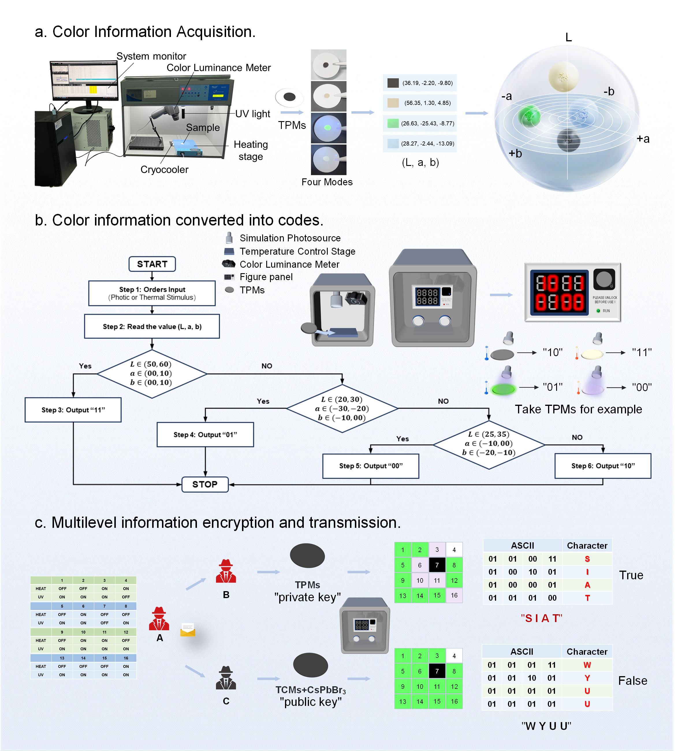 此外,該團(tuán)隊(duì)還針對(duì)性地設(shè)計(jì)了一套以熱致變色鈣鈦礦微膠囊為“密鑰”的多級(jí)信息加密系統(tǒng)。在操作口令的驅(qū)動(dòng)下,采集設(shè)備將測(cè)定不同狀態(tài)下微膠囊的CIE-Lab值,并將信號(hào)轉(zhuǎn)化成與之對(duì)應(yīng)的ACSII碼,最終根據(jù)密碼簿中ACSII碼與字母的對(duì)應(yīng)關(guān)系獲得真實(shí)信息。