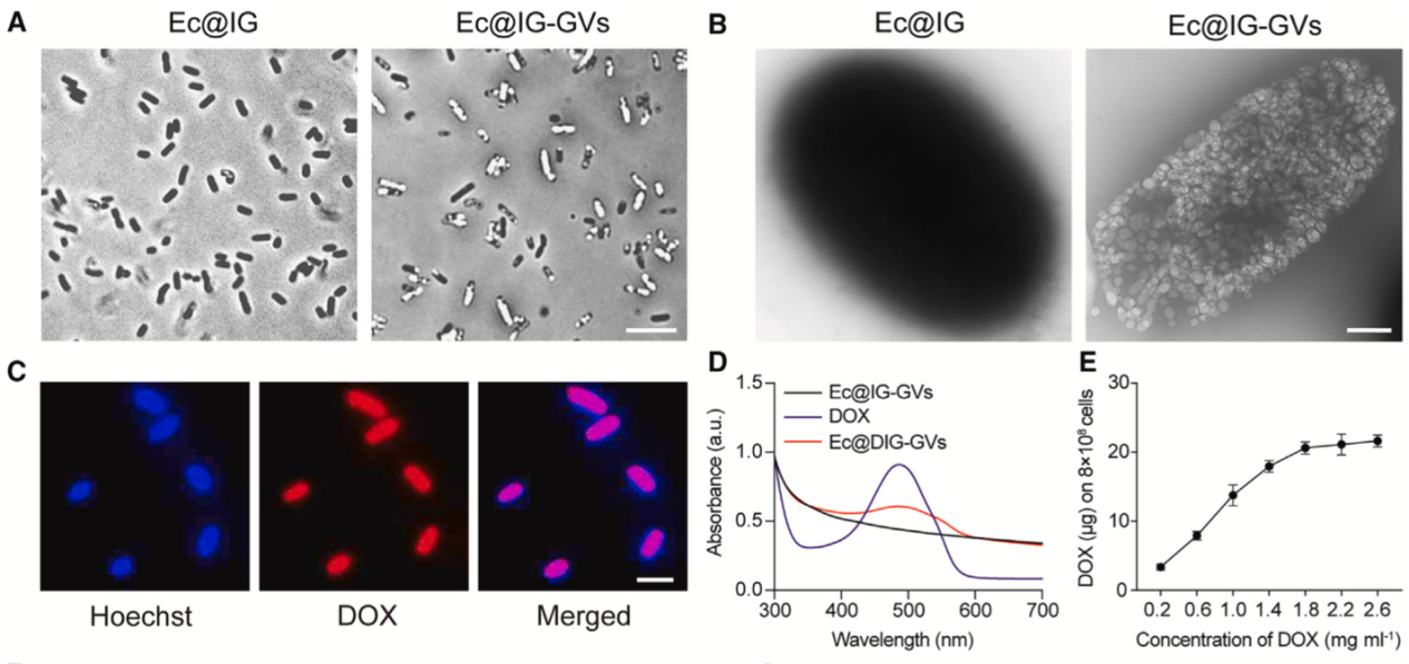 研究團(tuán)隊首先將聲學(xué)報告基因(ARG1)質(zhì)粒和溫控基因線路(IFN-γ)質(zhì)粒依次導(dǎo)入至大腸桿菌MG1655中,獲得了Ec@IG,接著在體外誘導(dǎo)Ec@IG內(nèi)的聲學(xué)報告基因表達(dá)GVs獲得含生物納泡細(xì)菌Ec@IG-GVs。最后,利用化學(xué)修飾策略將阿霉素連接至Ec@IG-GVs表面制備獲得了超聲可視化的工程化細(xì)菌Ec@DIG-GVs。透射電鏡及相差顯微鏡結(jié)果證實Ec@DIG-GVs細(xì)菌內(nèi)部表達(dá)了大量的生物納泡(GVs),免疫熒光標(biāo)記和吸收光值測定表明阿霉素成功偶聯(lián)至細(xì)菌表面(圖1)。
