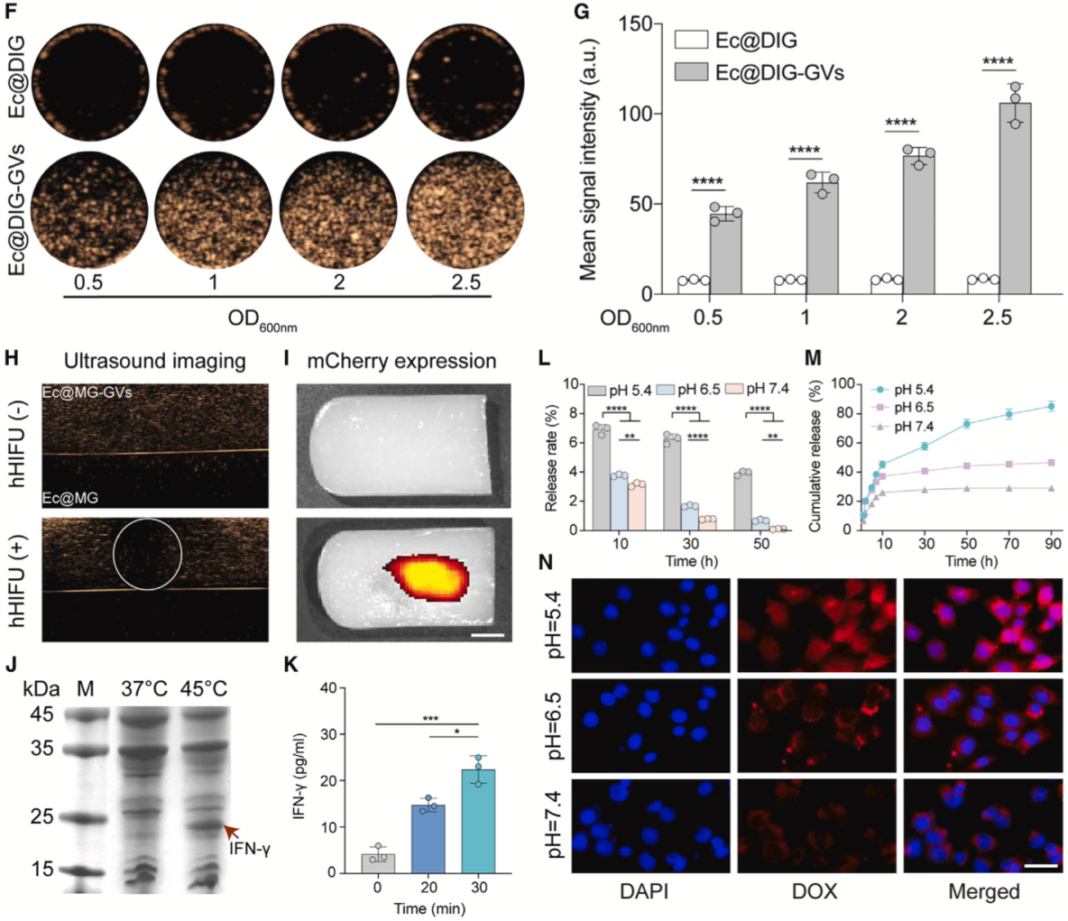 研究團(tuán)隊進(jìn)一步對Ec@DIG-GVs的各項功能進(jìn)行了驗證。首先確認(rèn)了含GVs的Ec@DIG-GVs具有超聲造影成像信號且具有濃度依賴性增強(qiáng)。同時,為了驗證超聲成像引導(dǎo)hHIFU刺激工程化細(xì)菌內(nèi)溫控基因線路表達(dá)外源基因的可行性,研究團(tuán)隊將Ec@IG-GVs中的IFN-γ基因替換為mCherry報告基因(Ec@MG-GVs),并將該細(xì)菌包埋至瓊脂凝膠內(nèi)(上層為含泡細(xì)菌,下層為不含泡細(xì)菌),在超聲成像引導(dǎo)下將hHIFU焦點(diǎn)定位至Ec@MG-GVs處輻照25分鐘,結(jié)果顯示hHIFU輻照的區(qū)域由于GVs的爆破出現(xiàn)了超聲信號的消失,37°C放置6小時后發(fā)現(xiàn)僅僅接收hHIFU的區(qū)域出現(xiàn)了明顯的紅色熒光,表明工程化細(xì)菌可以實現(xiàn)超聲造影引導(dǎo)hHIFU定點(diǎn)誘導(dǎo)mCherry蛋白的表達(dá)。此外,通過將Ec@DIG-GVs置于不同pH值條件下,證實了DOX能夠?qū)崿F(xiàn)酸響應(yīng)性釋放并有效進(jìn)入腫瘤細(xì)胞(圖2)。