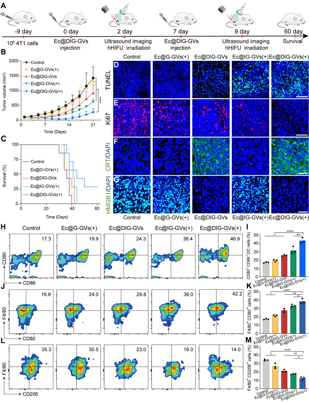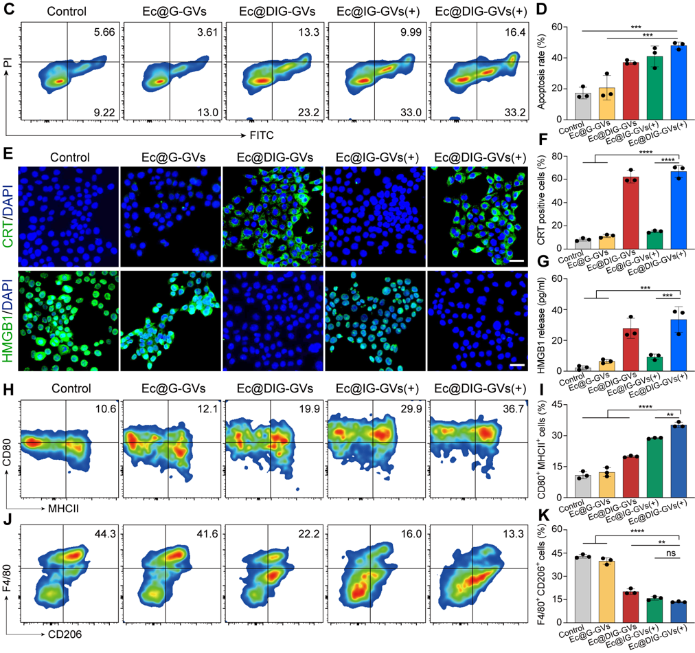 隨后,研究團(tuán)隊測試了Ec@DIG-GVs的腫瘤細(xì)胞殺傷活性和免疫激活的情況,將Ec@DIG-GVs進(jìn)行酸性處理并給予hHIFU輻照誘導(dǎo)IFN-γ的表達(dá),離心去除細(xì)菌后獲得了含有DOX和IFN-γ的上清液。將該上清液與腫瘤細(xì)胞孵育后,可見腫瘤細(xì)胞發(fā)生明顯的凋亡和免疫原性死亡(CRT、HMGB1蛋白標(biāo)志物的檢測)。將該上清液與巨噬細(xì)胞共孵育后發(fā)現(xiàn)M1型巨噬細(xì)胞占比明顯增加,說明Ec@DIG-GVs所釋放的IFN-γ和DOX具有殺傷腫瘤并能誘導(dǎo)M1型巨噬細(xì)胞極化(圖3)。