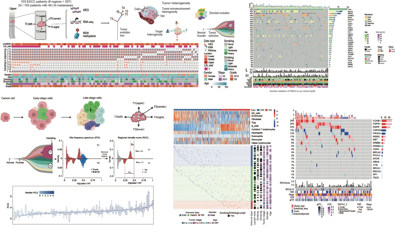 本研究對(duì)來自中國太行山區(qū)的103名ESCC患者的507個(gè)空間多位點(diǎn)樣本進(jìn)行了多組學(xué)測序,包括全外顯子組、轉(zhuǎn)錄組以及850K甲基化芯片測序。每個(gè)樣品有明確的空間位置信息,分別來自腫瘤的“上-下-左-右-中”5個(gè)位點(diǎn)。基于該大規(guī)模組學(xué)數(shù)據(jù)深入分析了突變驅(qū)動(dòng)基因、克隆進(jìn)化模式、免疫微環(huán)境和生活環(huán)境等特征之間的相互作用,解析了ESCC的空間異質(zhì)性圖譜,提出了食管鱗癌的定向進(jìn)化模式,以及潛在的治療靶點(diǎn)。為了解中國人群食管鱗癌的腫瘤演化機(jī)制通以及臨床取樣提供了重要理論依據(jù)。