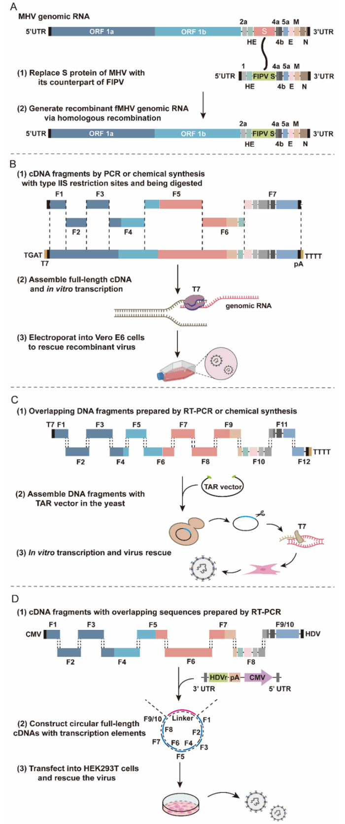 合成DNA已被廣泛應(yīng)用于研究、診斷和治療等領(lǐng)域,其重要應(yīng)用之一則是構(gòu)建合成型基因組。在沒有天然模板的情況下從頭合成病毒基因組對病毒學(xué)研究至關(guān)重要,它為全面了解病毒基因的功能和表達(dá)及其致病機(jī)制提供了新的技術(shù)手段。此外,利用該技術(shù),還可以對病毒基因組進(jìn)行大規(guī)模的遺傳修飾和功能表征,這是傳統(tǒng)分子生物學(xué)方法無法實(shí)現(xiàn)的。反向遺傳學(xué)是另一種基于生物遺傳信息,通過修改特定基因或非編碼核酸,如通過靶向基因突變或基因插入/刪除/替換,來研究基因組結(jié)構(gòu)和功能的方法。此外,它不僅可以用于全面分析分子特征、發(fā)病機(jī)制和病毒-宿主相互作用,還可以通過直接操縱RNA病毒基因組開發(fā)新型疫苗。反向遺傳學(xué)的基本構(gòu)建策略是:(1)通過RT-PCR或化學(xué)合成獲得病毒基因組的所有DNA片段;(2)通過靶向RNA重組、體外連接、轉(zhuǎn)化相關(guān)重組或環(huán)狀聚合酶延伸反應(yīng)(CPER)將這些片段組裝成全長互補(bǔ)DNA(cDNA),然后(3)將獲得的cDNA轉(zhuǎn)染到易感細(xì)胞內(nèi),完成病毒拯救(如圖2)。合成基因組學(xué)和反向遺傳學(xué)被廣泛用于病毒的全基因組合成,包括SARS-CoV、MERS-CoV和SARS-CoV-2等,成為病毒學(xué)研究中不可或缺的工具。