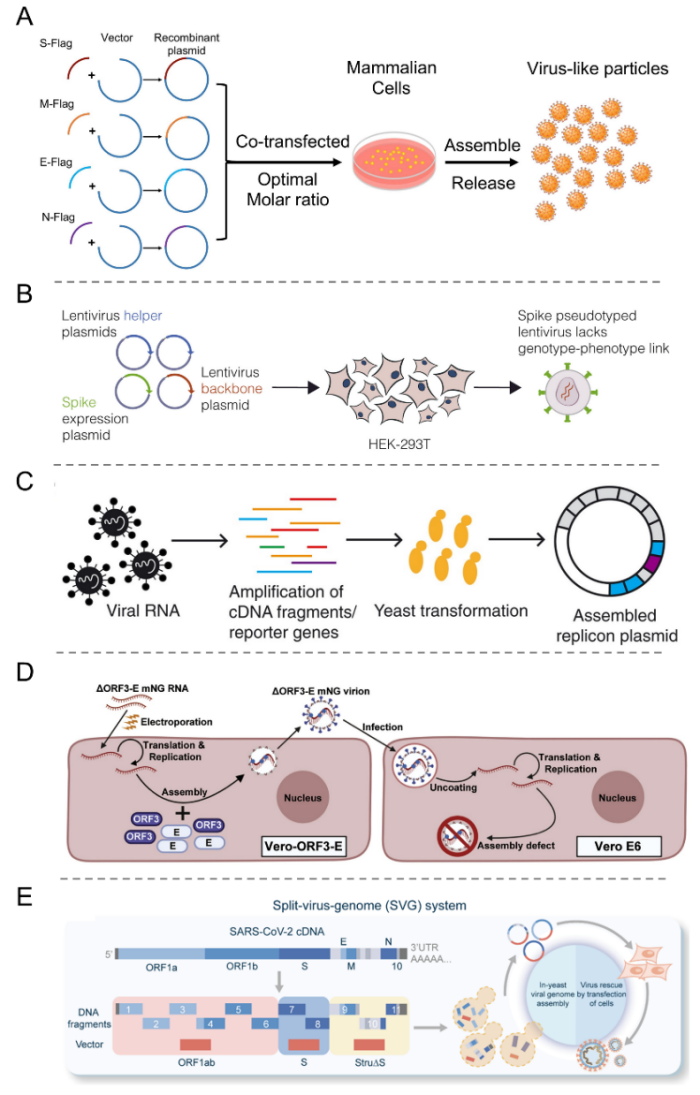 另外,開發(fā)具有生物安全性的工程化病毒系統(tǒng)也是至關(guān)重要的(如圖3)。病毒樣顆粒(VLPs)是由一個(gè)或多個(gè)病毒結(jié)構(gòu)蛋白自組裝形成的中空顆粒,形態(tài)與野生型病毒相似且可以特異性侵染宿主細(xì)胞。VLPs以高密度展示外源抗原表位,能夠促進(jìn)抗原呈遞細(xì)胞的攝取,從而有效誘導(dǎo)細(xì)胞免疫和中和抗體反應(yīng)。假病毒(Pseudovirus)是通過重組來自不同病毒的骨架蛋白和包膜蛋白構(gòu)建而成的。常用的骨架病毒包括人類免疫缺陷病毒(HIV)、水皰性口炎病毒(VSV)和小鼠白血病病毒(MLV)。另一種提高生物安全性的常用策略是構(gòu)建病毒復(fù)制子(Replicon),這是一類可自我復(fù)制的亞基因組系統(tǒng),通常會(huì)通過報(bào)告基因取代編碼病毒結(jié)構(gòu)蛋白的基因。另兩種工程化病毒系統(tǒng)分別是反式互補(bǔ)系統(tǒng)(Trans-Complementation System)和基因組拆分系統(tǒng)(Split-Virus-Genome?System,SVG),構(gòu)建得到包含所有病毒成分的基因組缺陷病毒,能夠模擬真實(shí)的病毒生命周期,且不產(chǎn)生子代病毒,用以研究蛋白質(zhì)功能和病毒粒子組裝。