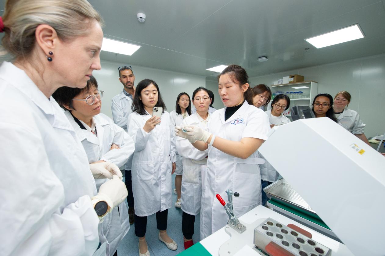 在雙標(biāo)水技術(shù)培訓(xùn)班上,張雪映(前右)向外籍科研人員展示了雙標(biāo)水樣本前處理的蒸餾技術(shù)