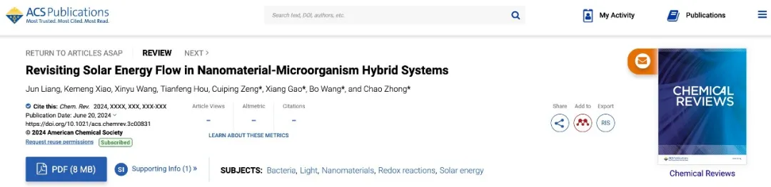 6月21日,中國(guó)科學(xué)院深圳先進(jìn)技術(shù)研究院合成生物學(xué)研究所材料合成生物學(xué)研究中心(以下簡(jiǎn)稱(chēng)“深圳先進(jìn)院合成所材料中心”)王博團(tuán)隊(duì)、高翔團(tuán)隊(duì)和鐘超團(tuán)隊(duì)在國(guó)際著名學(xué)術(shù)期刊Chemical Reviews聯(lián)合在線(xiàn)發(fā)表綜述文章“Revisiting solar energy flow in nanomaterial-microorganism hybrid systems”。文章從系統(tǒng)層面論述了納米材料-微生物雜合體系捕獲太陽(yáng)能并轉(zhuǎn)化為化學(xué)能的過(guò)程與機(jī)理,對(duì)該體系相關(guān)研究的重要進(jìn)展和面臨的挑戰(zhàn)進(jìn)行了分析與總結(jié),對(duì)未來(lái)發(fā)展方向和潛在應(yīng)用領(lǐng)域進(jìn)行了思考與展望。