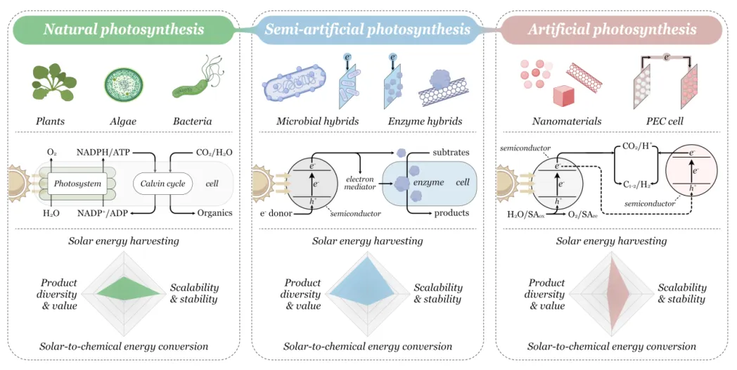圖1. 自然光合作用、半人工光合作用和人工光合作用的主要特征以及各自?xún)?yōu)勢(shì)。
