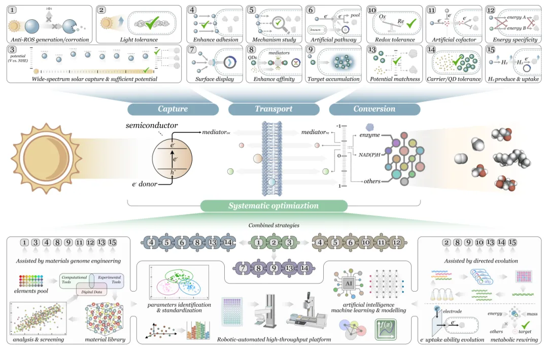 NMHS有潛力成為太陽(yáng)能驅(qū)動(dòng)生產(chǎn)化學(xué)品的清潔平臺(tái),這對(duì)于推動(dòng)能源結(jié)構(gòu)轉(zhuǎn)型和實(shí)現(xiàn)人類(lèi)社會(huì)可持續(xù)發(fā)展至關(guān)重要。通過(guò)本篇綜述,研究團(tuán)隊(duì)回顧了該領(lǐng)域最新的研究進(jìn)展,明確了NMHS后續(xù)發(fā)展所面臨的挑戰(zhàn),提出了系統(tǒng)級(jí)別的解決方案和優(yōu)化策略。以合成生物學(xué)技術(shù)為代表的現(xiàn)代科技手段可以在提高產(chǎn)品價(jià)值、豐富產(chǎn)物多樣性和優(yōu)化微生物生產(chǎn)效率等關(guān)鍵環(huán)節(jié)賦能NMHS,從而有效推動(dòng)系統(tǒng)的持續(xù)迭代進(jìn)化。一套具有實(shí)際應(yīng)用價(jià)值的NMHS需要有機(jī)整合并充分協(xié)調(diào)所有有利因素,而高效能量流動(dòng)的成功實(shí)現(xiàn)是NMHS能從實(shí)驗(yàn)室邁向工業(yè)生產(chǎn)的基石。