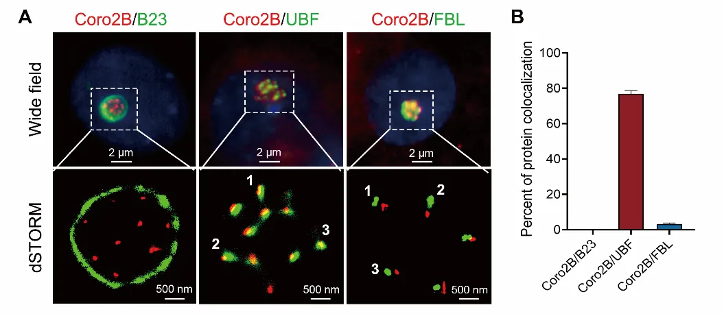 圖1. 超高分辨率顯微成像分析coronin 2B與核仁不同組分的共定位情況