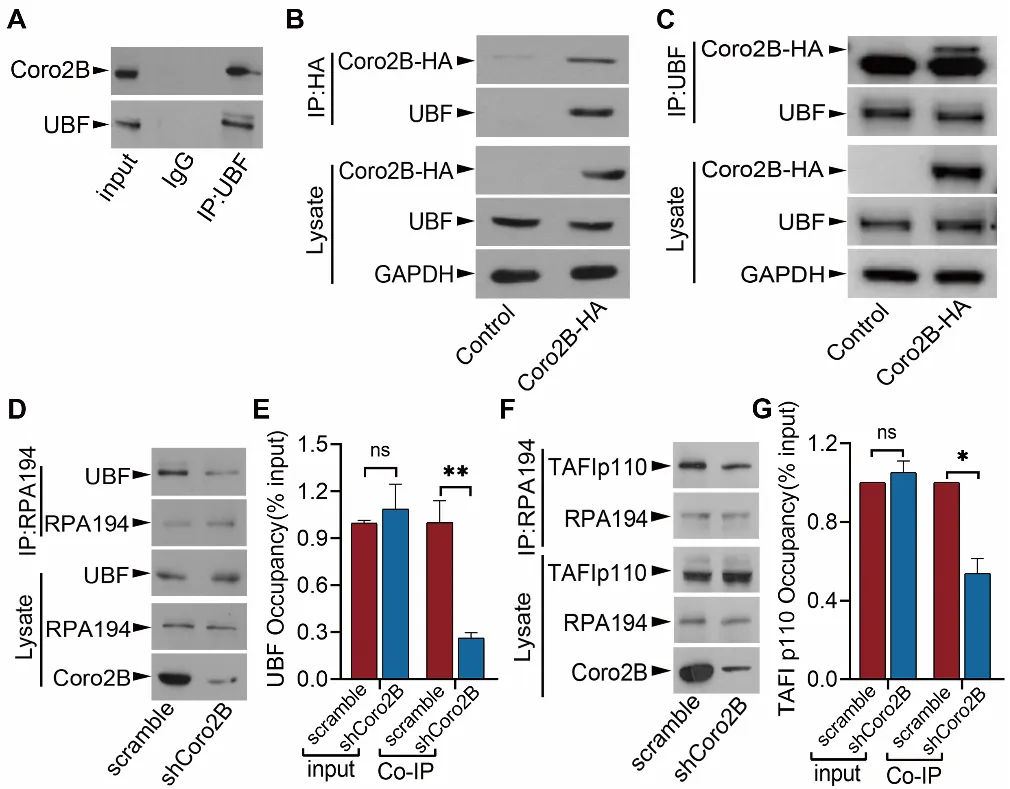 圖2. Coronin 2B結(jié)合于UBF,調(diào)控rDNA轉(zhuǎn)錄起始復(fù)合物的組裝