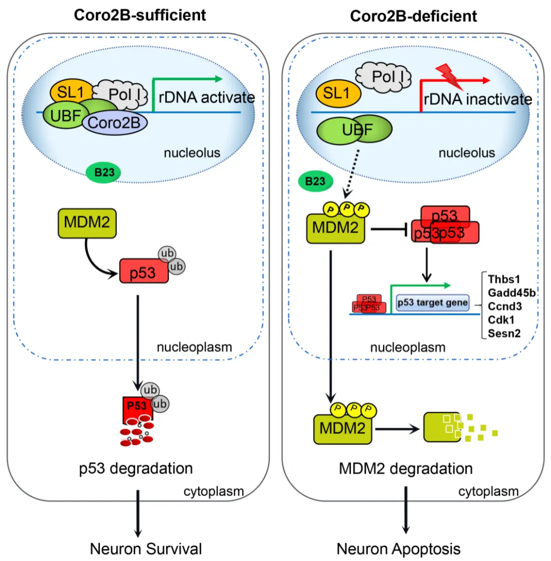 最后,研究人員發(fā)現(xiàn),coronin 2B缺失引發(fā)的核仁應(yīng)激反應(yīng),會(huì)抑制p53蛋白的降解,從而導(dǎo)致細(xì)胞核內(nèi)p53的過(guò)過(guò)度積累與激活,啟動(dòng)細(xì)胞凋亡程序,引發(fā)神經(jīng)元的死亡(圖3)。