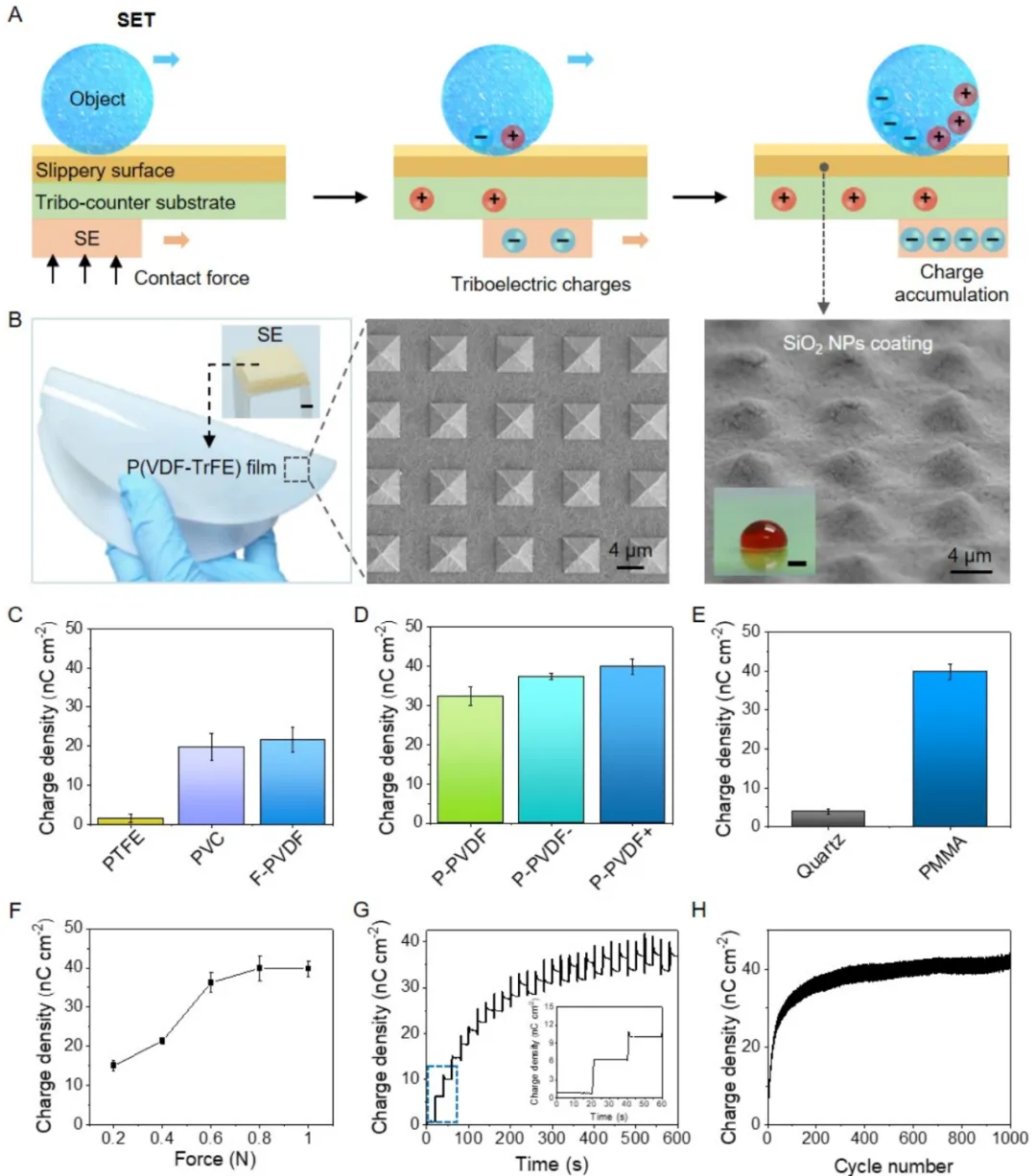 為解決物體操控靈活性和適應(yīng)性的問題,研究團隊基于前期光誘導(dǎo)帶電表面材料及液滴操控的研究基礎(chǔ)上,成功設(shè)計出無需復(fù)雜電極陣列和外部電源的摩擦發(fā)電供能的靜電鑷(Self-powered electrostatic tweezer,?SET)。該SET由表面設(shè)計有微結(jié)構(gòu)的P(VDF-TrFE)基自供能電極(Self-powered electrode,SE)、摩擦對介電襯底(Tribo-counter substrate)和潤滑表面(Slippery surface)三部分組成。