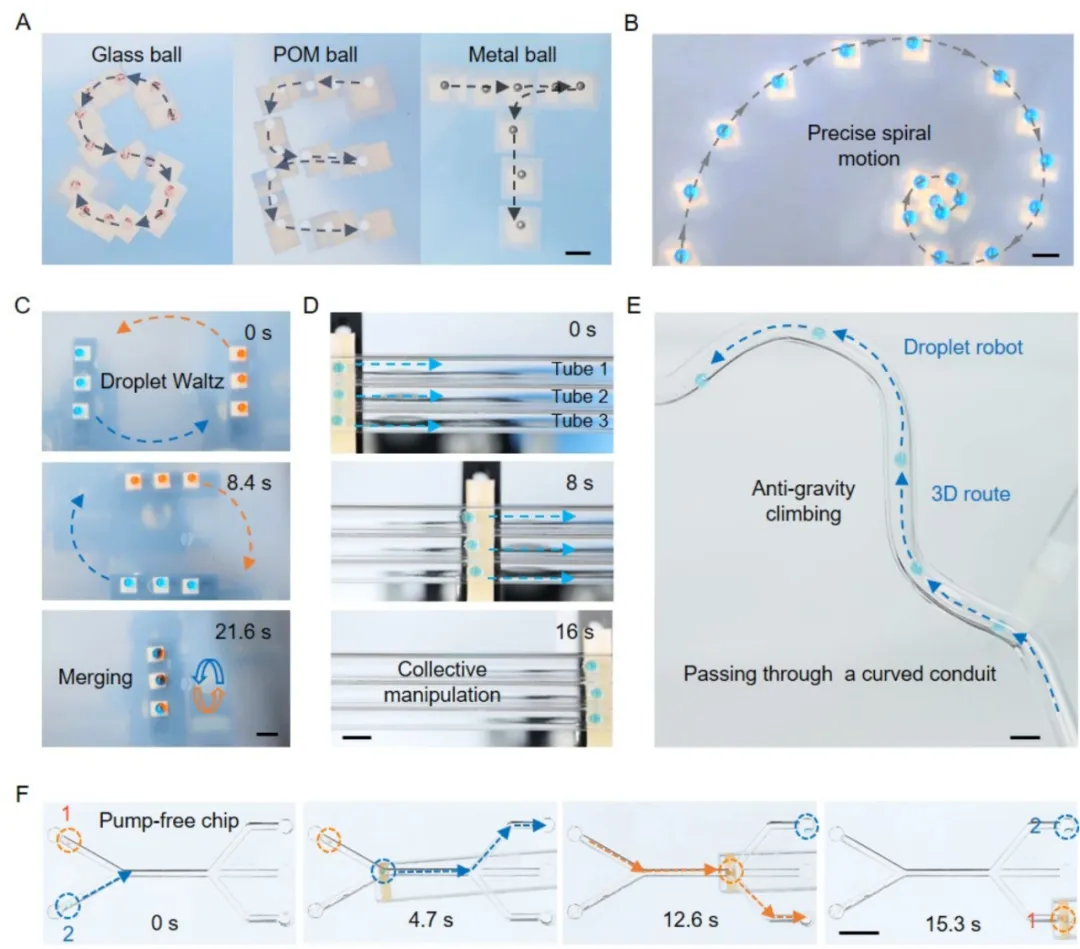 SET不僅適用于包括PMMA、石英和氧化鋁陶瓷在內(nèi)的多種電介質(zhì)襯底材料,而且適用于P(VDF-TrFE)和聚二甲基硅氧烷(PDMS)等多種潤滑層設(shè)計,同時還適用于開放到封閉體系、手持到機械操控系統(tǒng)、單個物體到多個物體,以及二維到三維路徑的精準(zhǔn)操控。SET的高度靈活性和適應(yīng)性可廣泛應(yīng)用于液滴分裂、液滴機器人、無泵微流控和細胞組裝等領(lǐng)域。SET有望為非接觸物體操控和微流體領(lǐng)域帶來全新的技術(shù)。