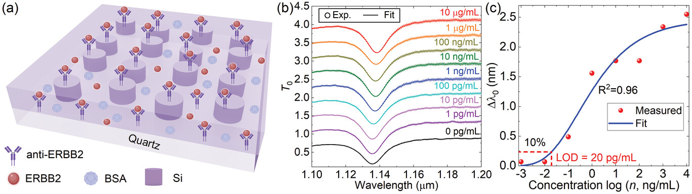 本研究通過設(shè)計一種由兩個相對位移的晶格復(fù)用形成的硅基超表面,利用兩個表面晶格共振模式之間的干涉相消實現(xiàn)了非局域準(zhǔn)束縛態(tài)(nonlocal q-BICs),在硅納米柱外的大體積區(qū)域內(nèi)產(chǎn)生了均勻且顯著的近場增強。實驗結(jié)果表明,該方法在折射率傳感應(yīng)用中實現(xiàn)了407 nm/RIU的高體折射率傳感靈敏度,并在早期乳腺癌篩查中對蛋白質(zhì)生物標(biāo)志物的檢出限達到了20 pg/mL,比目前的技術(shù)水平提高了35倍。